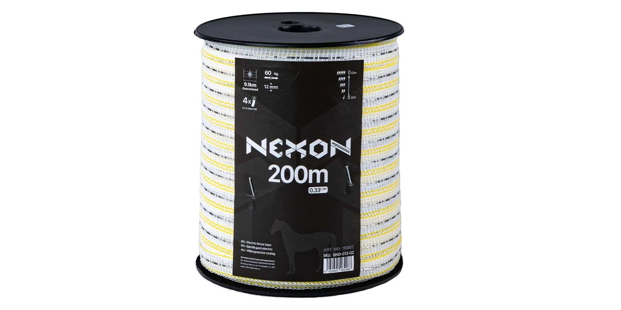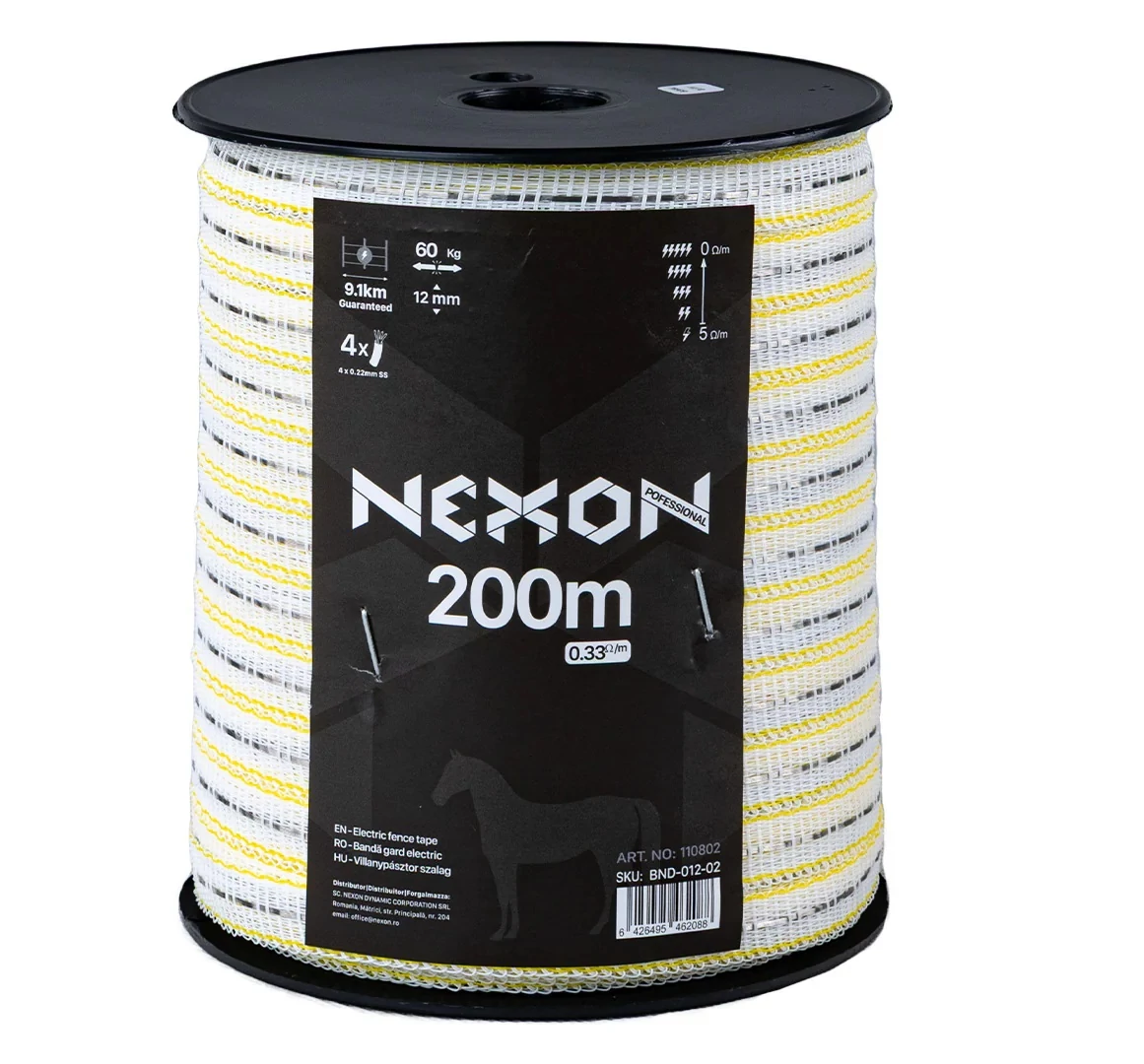 Bandă gard electric NEXON Professional 200 m 4 lite 60 kg | 64910274 | 88,96 Lei | Conductori pentru gard electric | Confort prin instalații de calitate | Melinda InstalSpecificații tehnice