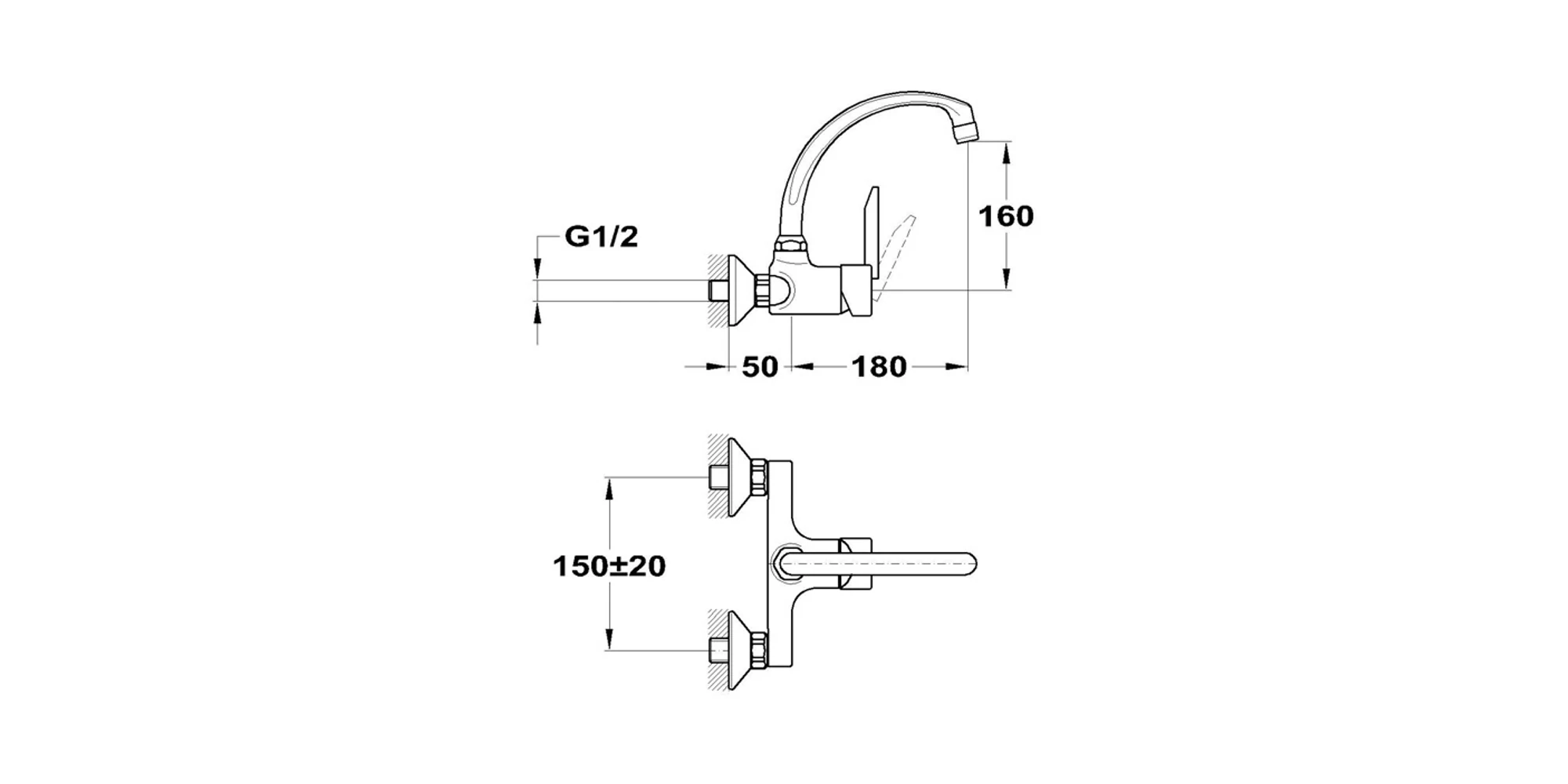 Baterie chiuvetă de perete, cu pipă superioară, 152-0034-00, Mambo-5, Mofém | 20310952 | 376,21 Lei | Baterie spalator | Confort prin instalații de calitate | Melinda InstalSpecificații tehnice