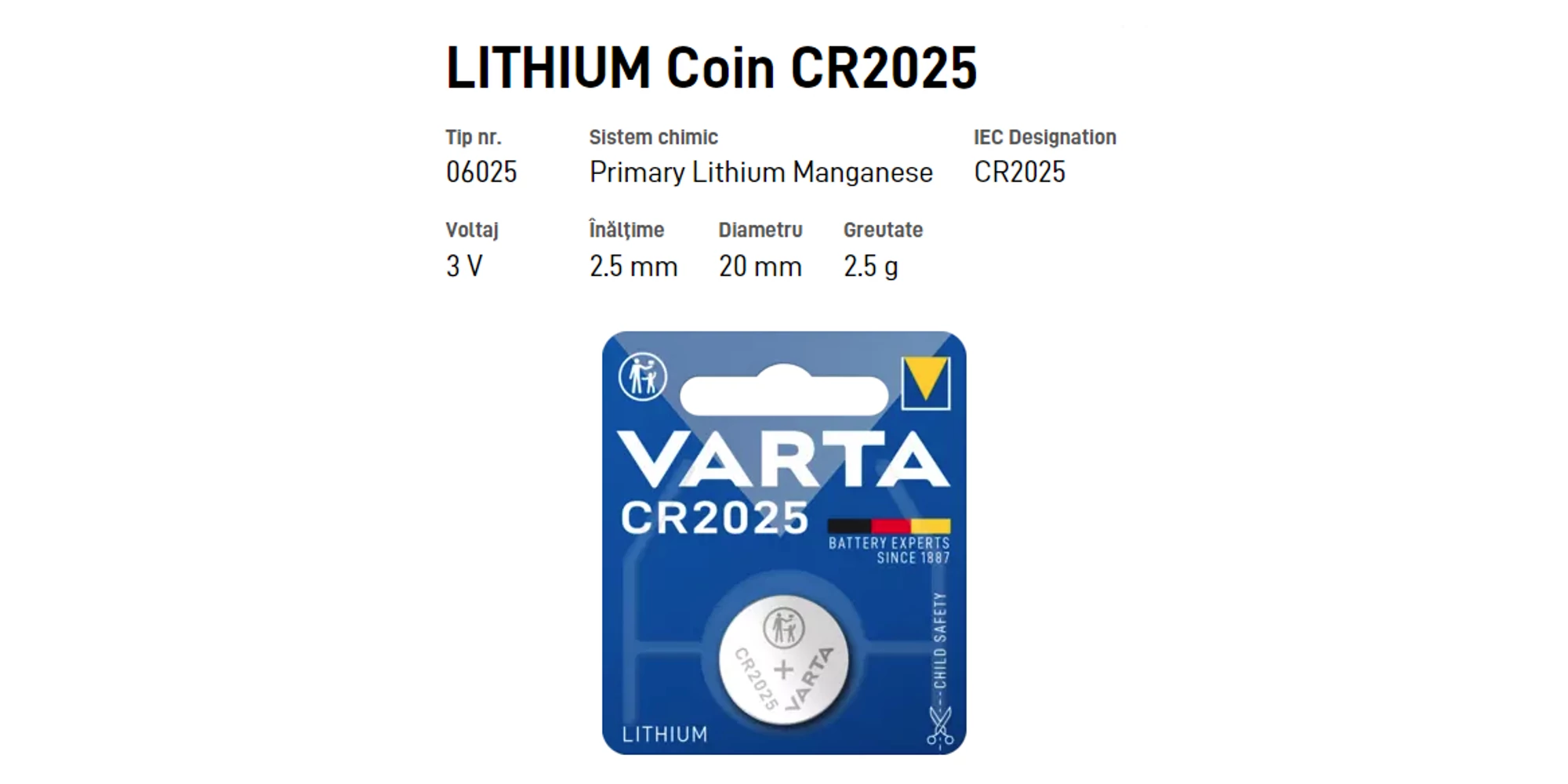 Bateriile rotunde cu litiu 3 V, CR2025, VARTA Lithium sunt concepute pentru a furniza energie fiabilă pentru dispozitivele electronice mici. Baterii care oferă cele mai înalte performanțe pentru aplicații cu impulsuri și descărcare continuă. Toate bateriile rotunde VARTA Litiu sunt ambalate îndeplinind cele mai înalte standarde de siguranță pentru copii. Perfect pentru diverse aplicații de bază și inteligente, cum ar fi brelocuri, telecomenzi, cântar, dispozitive inteligente de acasă și multe alte dispozitive electronice mici. Cea mai bună calitate și durată garantată.