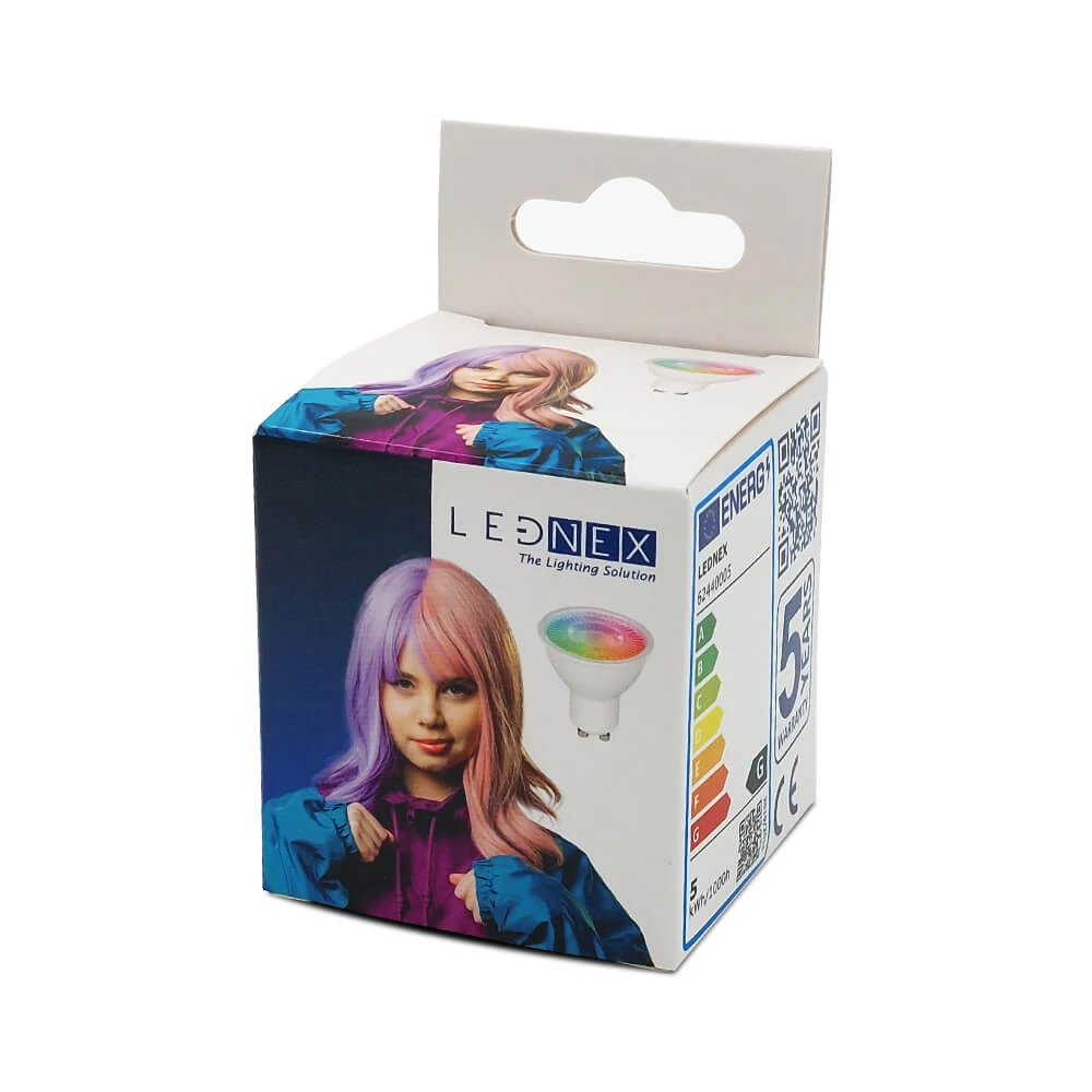 Becul LED color, SMART, 5 W, GU10, 345 lm, RGBW, LEDNEX este inteligent cu diferite funcții controlabile de la distanță de pe Smartphone care vă vor îmbunătăți viața de zi cu zi. Astfel de funcții sunt: pornit oprit, selectare culoare RGB, alb rece, alb cald sau sunt funcții accesibile din aplicația de smartphone alături de programare inteligentă orară/zilnică și diferite scenarii și moduri presetate. Astfel puteți controla luminile de acasă foarte ușor și in mod inteligent.