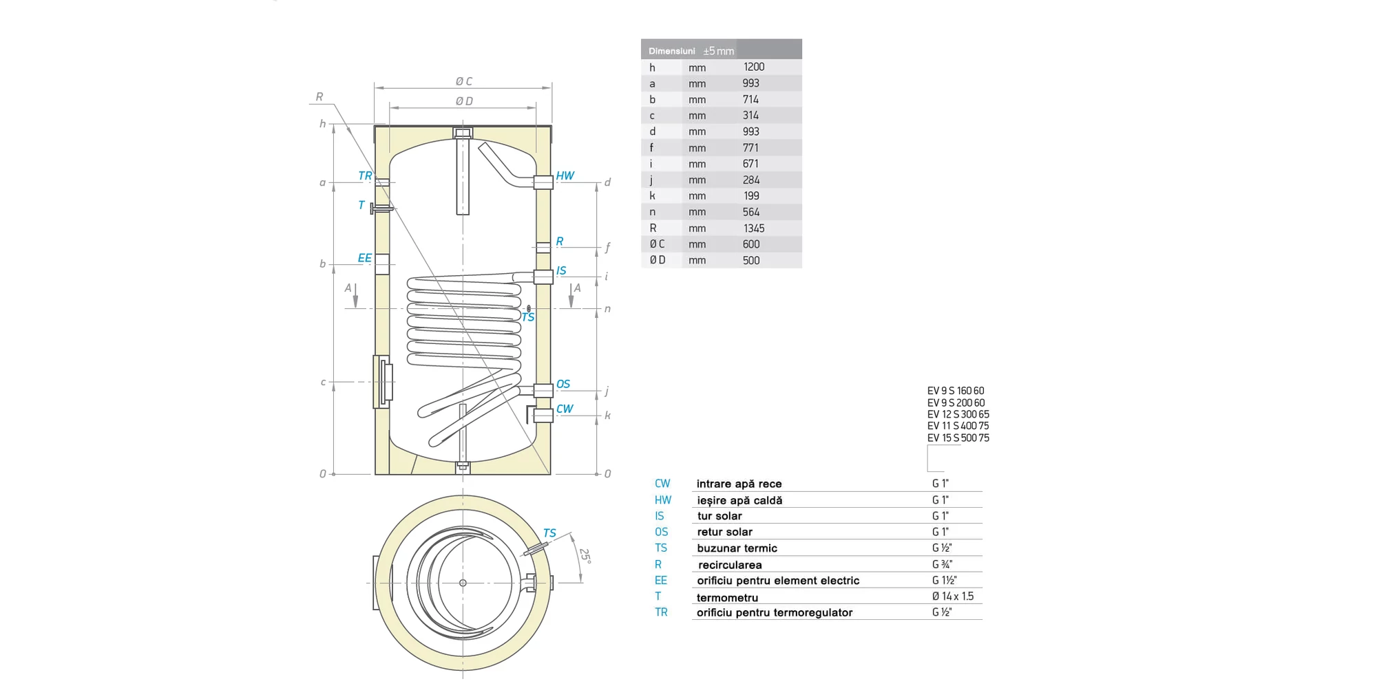 Boilerele indirecte cu 1 serpentină, 200 litri, montaj pe pardoseala, izolat, EV 9S 200 60, Tesy cu montaj pe pardoseală pentru apă caldă menajeră, cu o singură schimbător de căldură, cu colector intern cu capacitate mare, sunt potrivite pentru conectarea la 1 sursă de energie termică, de exemplu sisteme solare, pompe de căldură sau centrală termică în condensație.