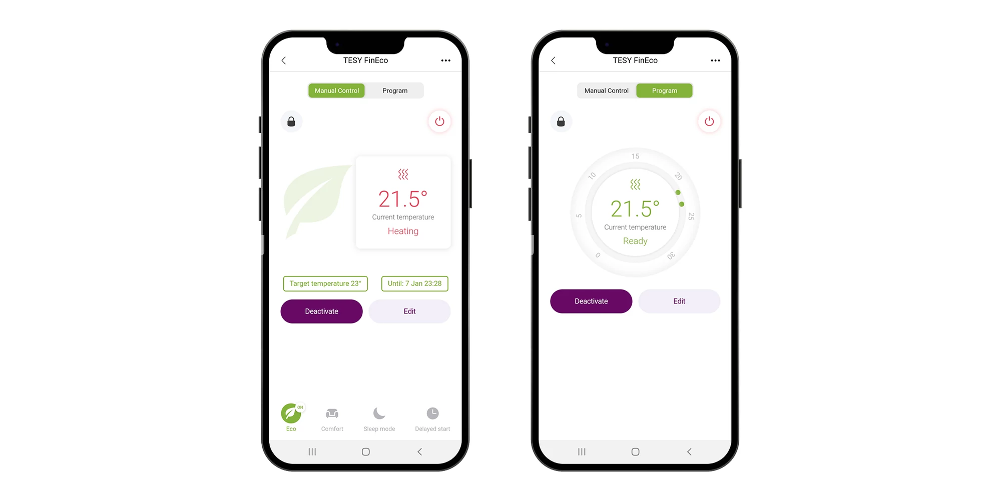 Aplicația MyTESY îți oferă libertatea de a gestiona caloriferul oriunde te afli în lume. Poți seta aparatul în modul Confort, pentru când ești acasă, la temperatura dorită – implicit 23°C, modul Eco, pentru când ești plecat, la temperatura implicită de 18°C, sau modul Sleep, care ajustează automat temperatura pentru somn odihnitor.