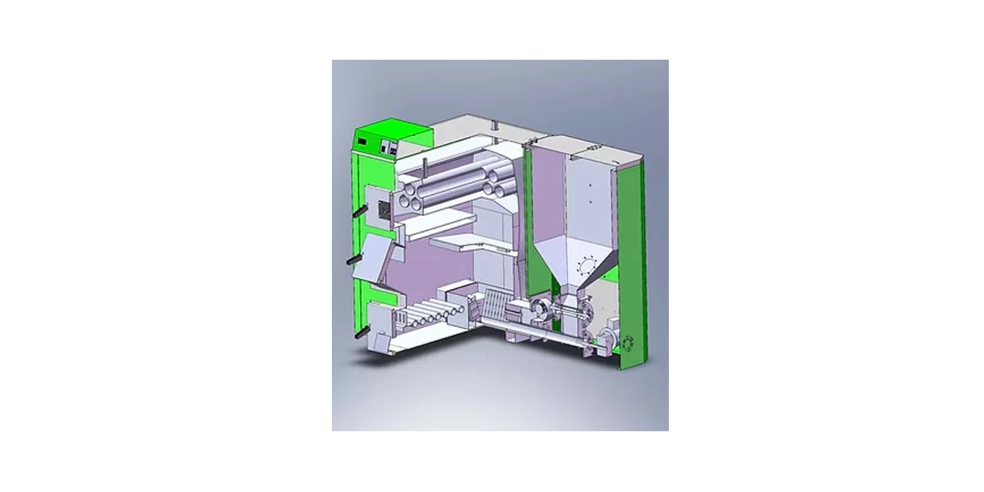 Camera de ardere este împărțită în două, mai exact, partea din față în care este posibil arderea combustibilului solid în bucăți și partea din spate unde se află camera de fluidizare în care se realizează arderea combustibilului autonom adică ale peleților. Prin urmare alimentarea cazanului cu bușteni se face pe ușa din mijloc a cazanului, în timp ce alimentarea cazanului cu peleți se face printr-un alimentatorul automat de peleți, care transportă combustibilul în camera de ardere pe partea laterală a cazanului.