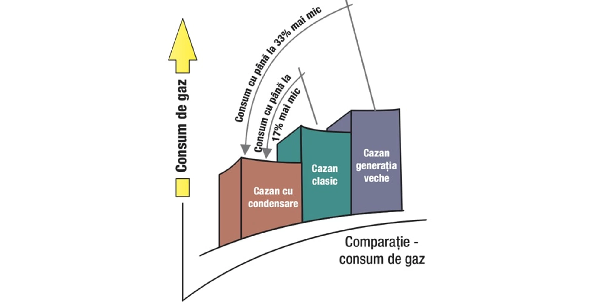 Tehnologia condensației determină scăderea consumului de combustibil, deoarece prin acest proces se recuperează o parte din căldura gazelor arse - astfel, temperatura setată a agentului termic nu depășește 55 °C, iar vaporii de apă din gazele de ardere condensează pe tubulatura de evacuare și se întorc în centrală în stare lichidă.
