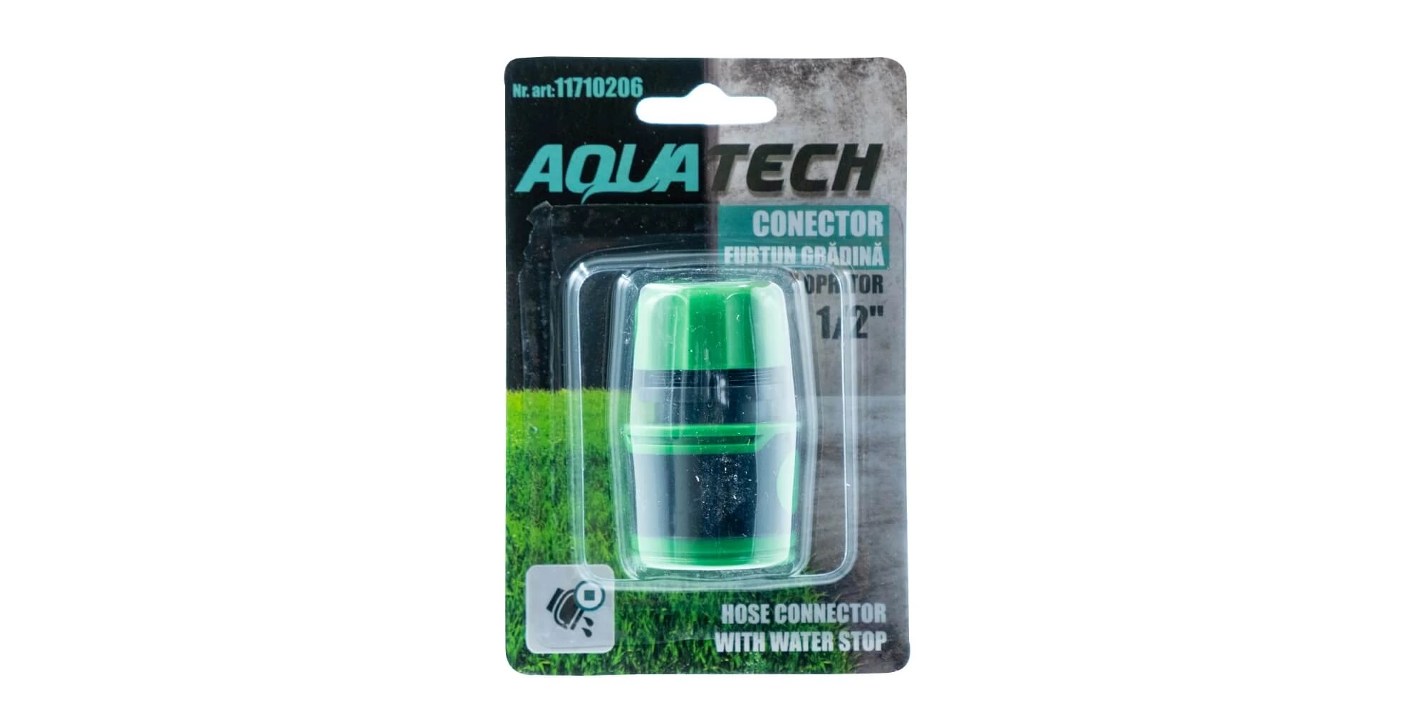 Conectorul pentru furtun grădină cu opritor 1/2" AQUATECH este destinat pentru utilizarea în sistemele de irigații. Conectorul este prevăzută cu sistem de oprire “aqua-stop”, ceea ce înseamnă că puteți deconecta furtunul fără a opri alimentarea cu apa.