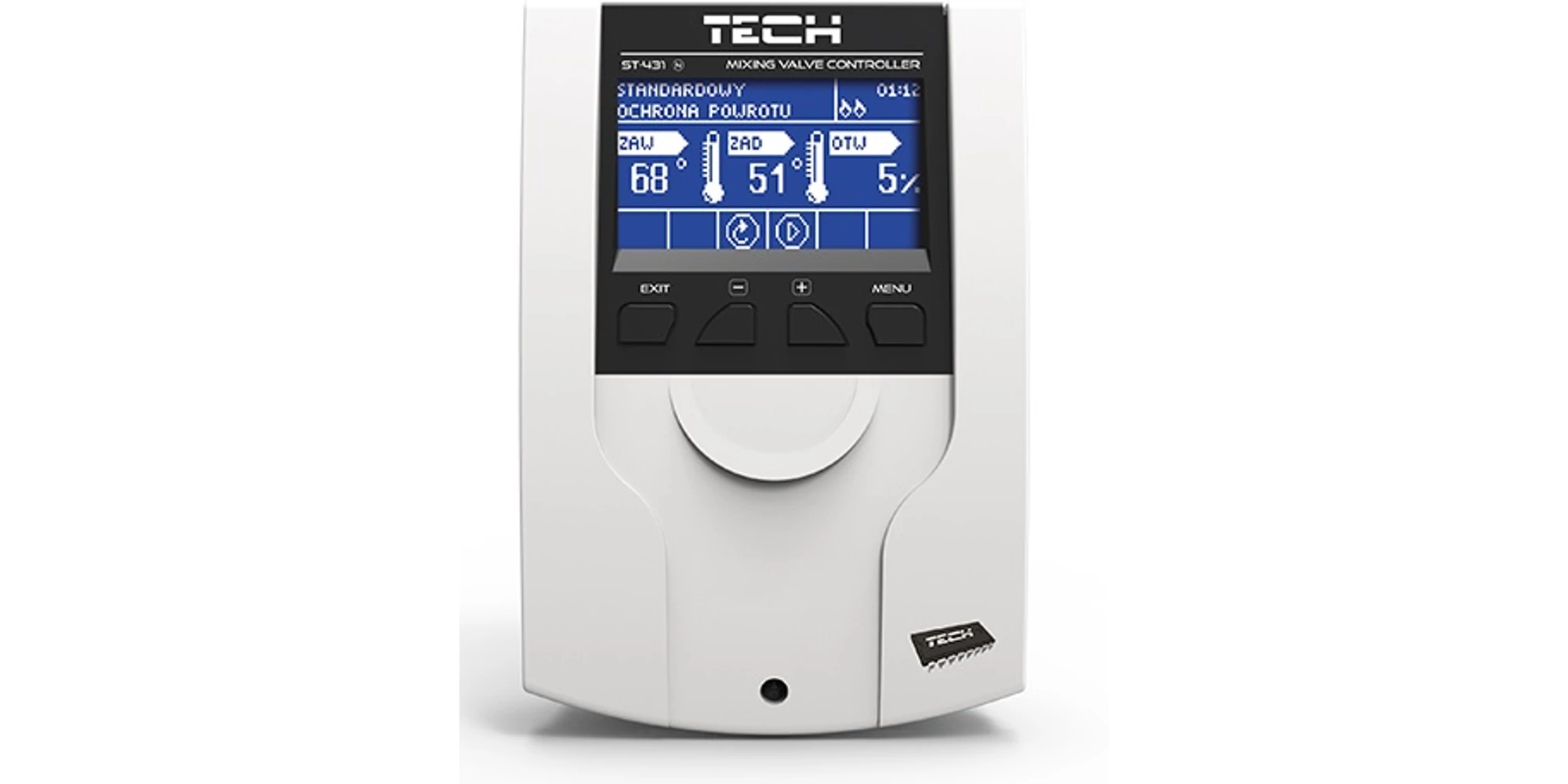 Controlerul echitermic pentru vană de amestec TECH EU-i1 are funcții de operare bazate pe temperatura exterioară și programarea săptămânală, putând funcționa în combinație cu un termostat de cameră. Un alt avantaj al controlerului TECH EU-i1 este funcția de protecție a returului împotriva temperaturii prea scăzute a apei.