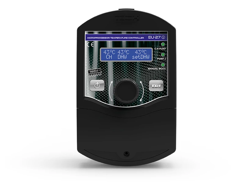 Controlerul pentru pompă de recirculare al încălzirii și pompă încărcare boiler TECH EU-27i are scopul de a controla operarea pompei de circulare încălzire centrală, precum și controlul adițional al pompei ACM. Sarcina controlerului pentru pompă de recirculare al încălzirii și pompă încărcare boiler TECH EU-27i este de a porni pompa de încălzire în cazul în care temperatura depășește limita prestabilită și de a opri pompa în cazul în care cazanul se oprește. Pentru a doua pompă, utilizatorul poate să seteze pornirea/oprirea, precum și temperaturile la care acesta va opera.