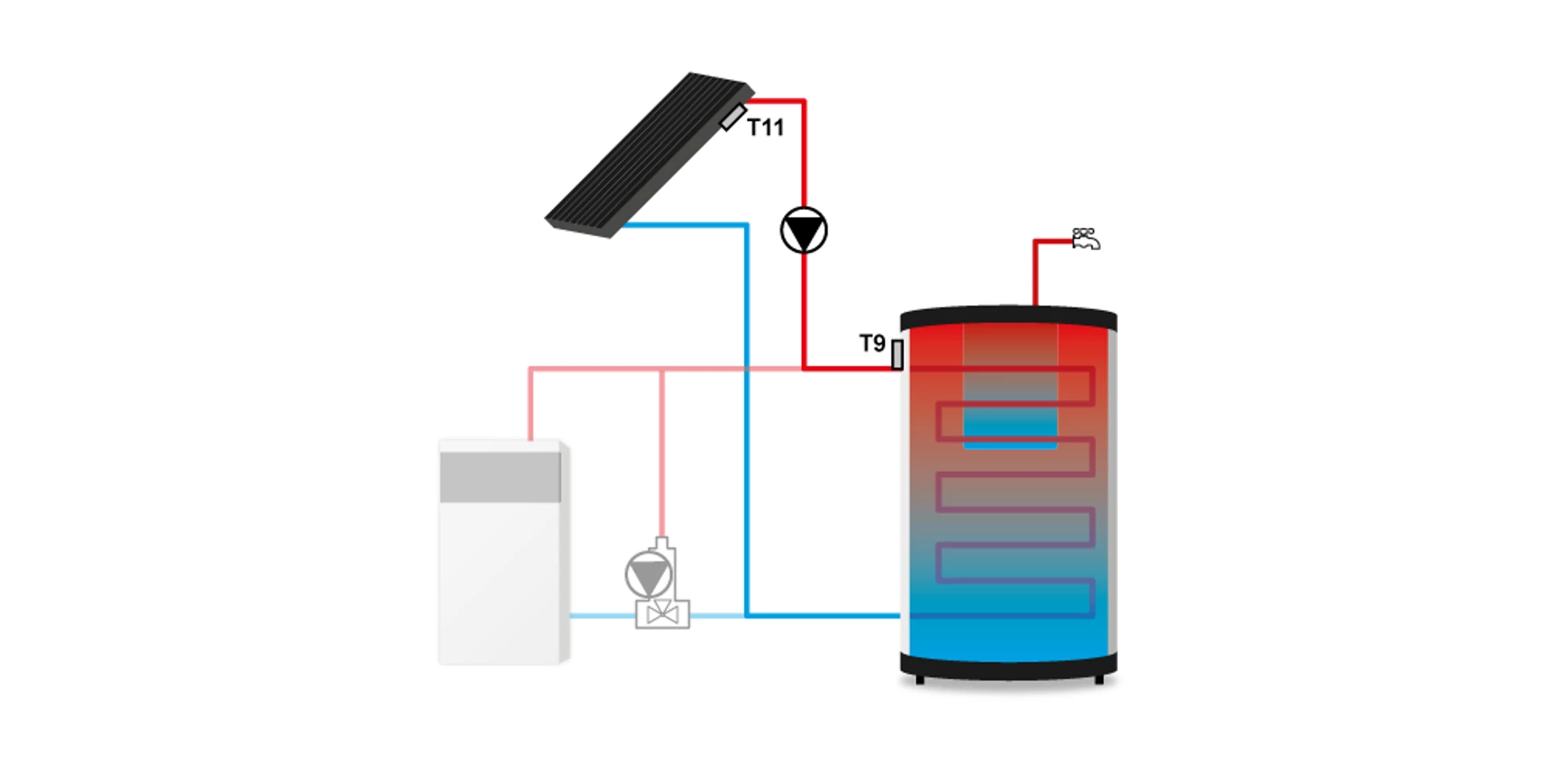 Controlerul solar TECH EU-21ND3 pornește pompa în cazul în care diferența de temperatură între cei doi senzori depășește limita prestabilită (T2-T1>A) și îl oprește în momentul în care temperatura dintre cei doi senzori este egală (T1=T2).