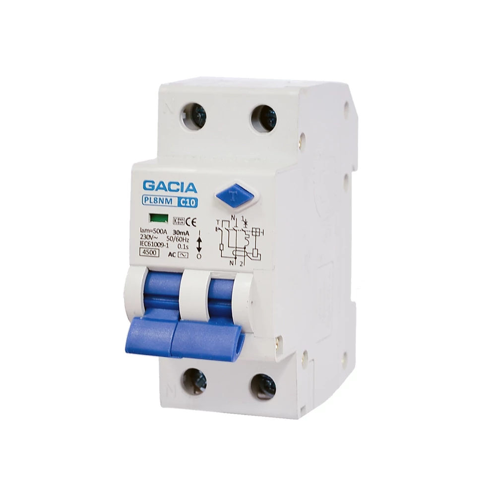 Disjunctor diferențial 1P+N C20 30MA AC GACIA asigură protecție împotriva curenților de suprasarcină, de scurtcircuit respectiv curenți reziduali într-o instalație electrică. Se montează pe șină DIN 35 mm.
