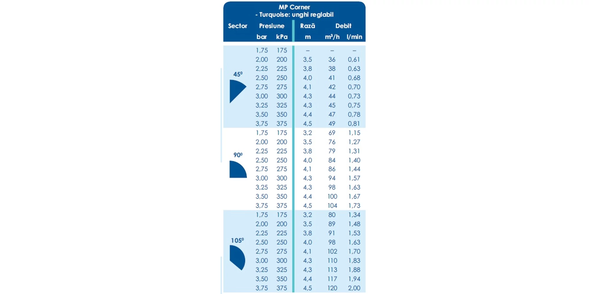 | Prezentul articol Duza MP-Corner 45-105 gr HUNTER, este alegerea perfectă din categoria Irigatii subterane, ceea ce înseamnă de asemenea Confort prin instalații de calitate | Melinda Instal | |