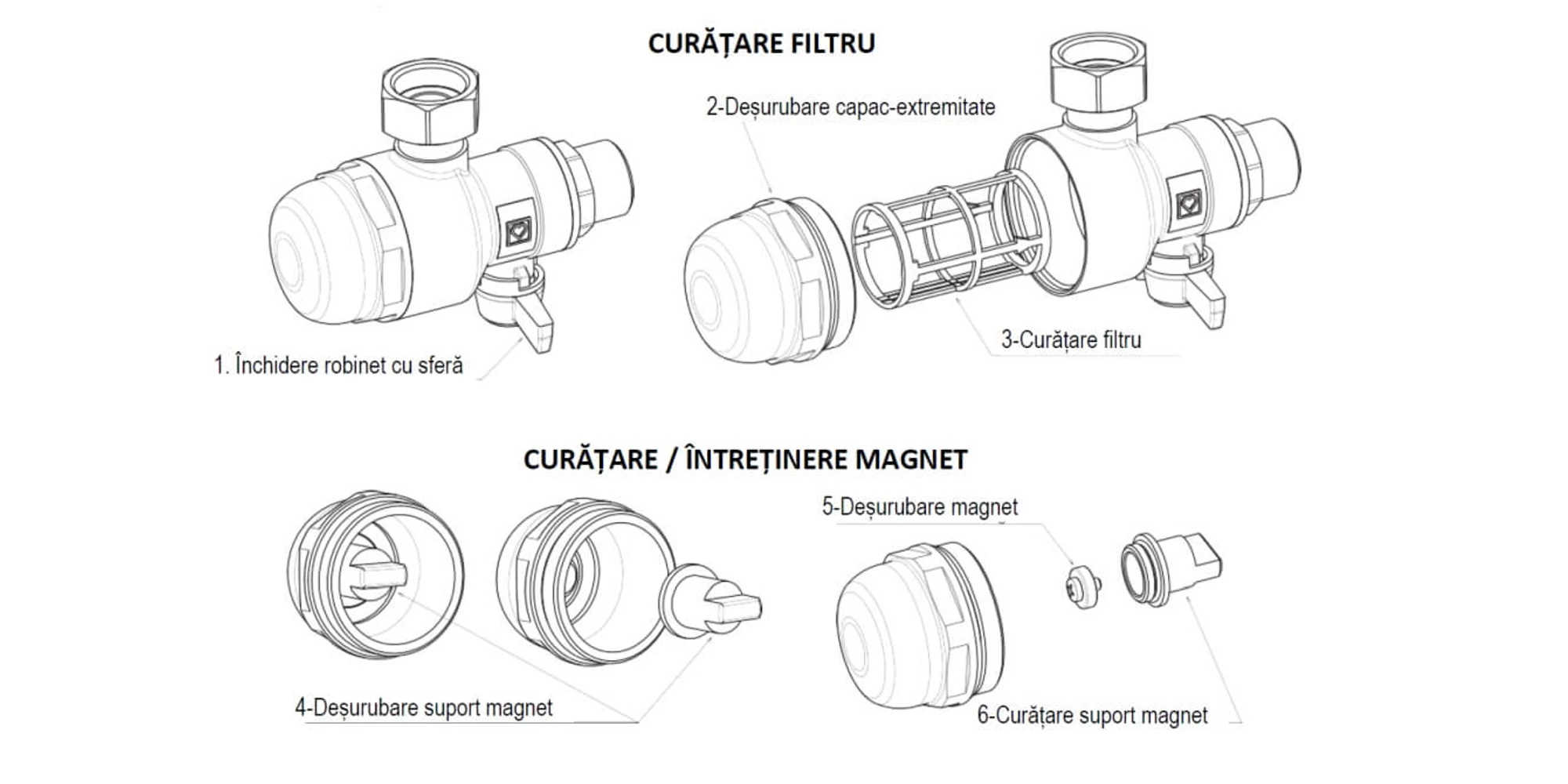 Pentru montaj filetele trebuie acoperite cu un material de etanșare adecvat (câlți, bandă de teflon, pastă de etanșare). Nu trebuie să existe exces de material de etanșare pentru că ar putea deteriora filetul. Filtrul antimagnetită HERZ 1 1125 02 cu montaj sub centrala termică murală se montează pe țeavă, la intrarea agentului termic în centrală. Țevile trebuie să fie aliniate corect, astfel încât filtrul să nu fie încărcat cu un moment de îndoire. Când utilizați țevi de cupru sau material plastic, luați în considerare limitele de presiune și temperatură ale materialului folosit. La montaj, utilizați un instrument de asamblare adecvat, care se adaptează la conexiunile finale ale filtrului.