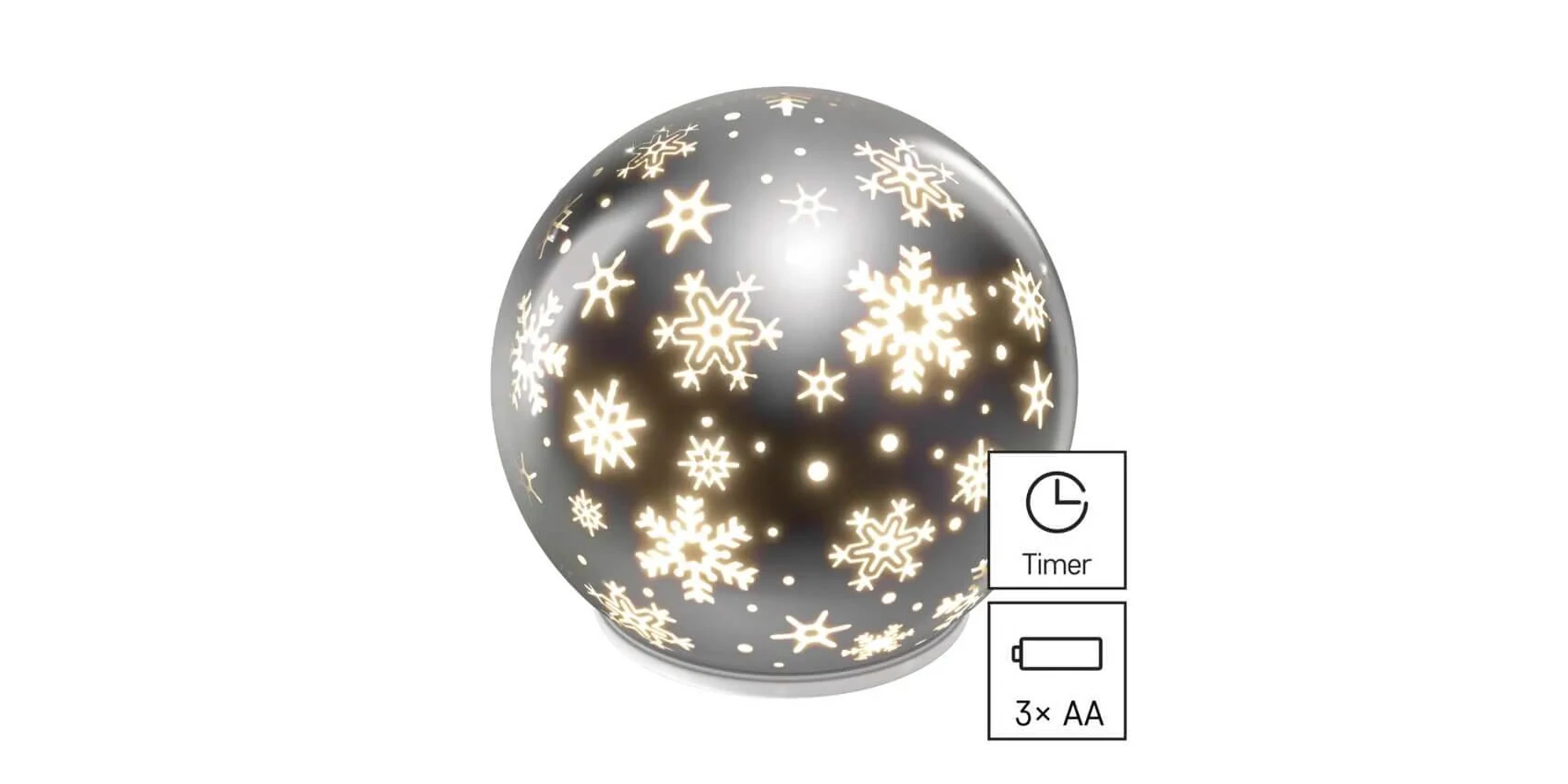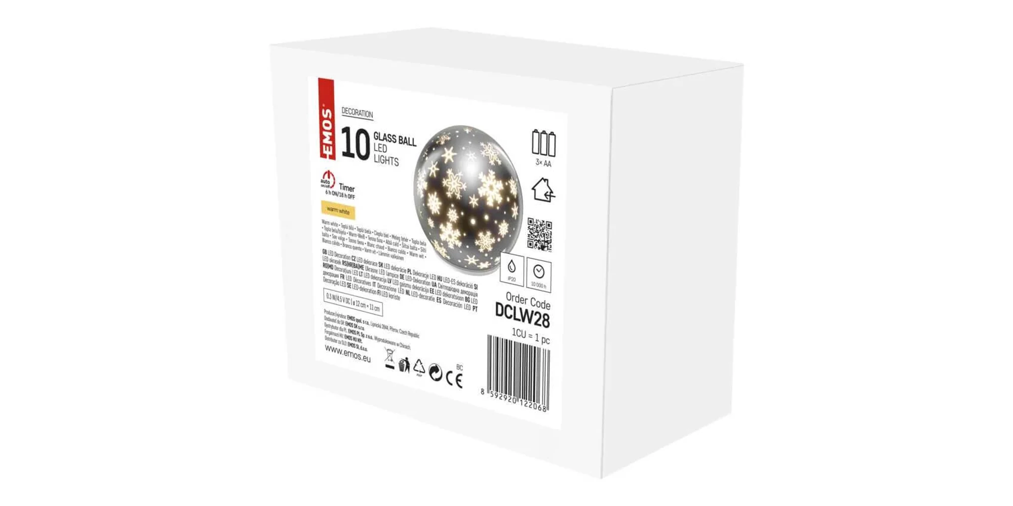 Glob de sticla cu LED-uri de Craciun - fulgi de zapada, 12 cm, 3x AA, interior, alb cald, cronometru, DCLW28, EMOS | 62930210 | 28,25 Lei | Decoratiuni de Craciun | Confort prin instalații de calitate | Melinda InstalSpecificații tehnice