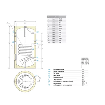 Boiler indirect cu 1 serpentina, 300 litri, montaj pe pardoseala, izolat, EV 12S 300 65, Tesy