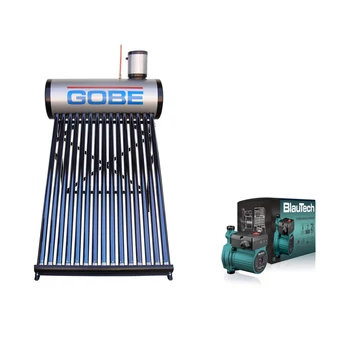 KIT S24 cu panou solar cu 20 tuburi pentru preparare apa calda menajera, rezervor nepresurizat 200 l GOBE + pompa ridicare presiune pentru panouri solare nepresurizate, corp din fonta, BlauTech