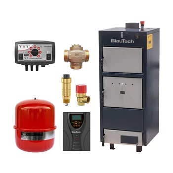Pachet incalzire Standard cu cazan pe lemne din tabla de otel 18 kW BlauTech, sursa neintreruptibila 300 W BlauTech, elemente de siguranta, vas expansiune, controler pompa TECH EU-19