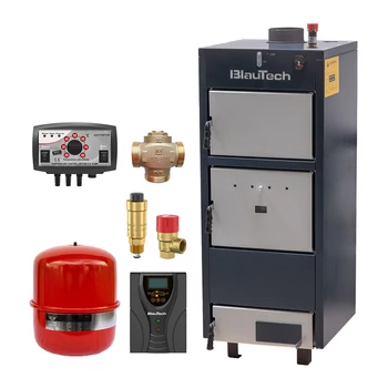 Pachet incalzire Standard cu cazan pe lemne din tabla de otel 47 kW BlauTech, sursa neintreruptibila 300 W BlauTech, elemente de siguranta, vas expansiune, controler pompa TECH EU-19