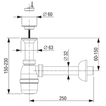 Sifon lavoar PP, grilă Ø 60 mm, scurgere Ø 32 mm, LIV 201647