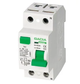 Întrerupătoarele diferențiale 1P+N 40A/30MA GACIA asigură protecție împotriva curenților reziduali într-o instalație electrică. Detectează componentă alternativă și continuă a curentului de defect. Protejează persoanele care intră în contact cu aceste aparate și cu circuitul electric. Se montează pe șină DIN 35mm.