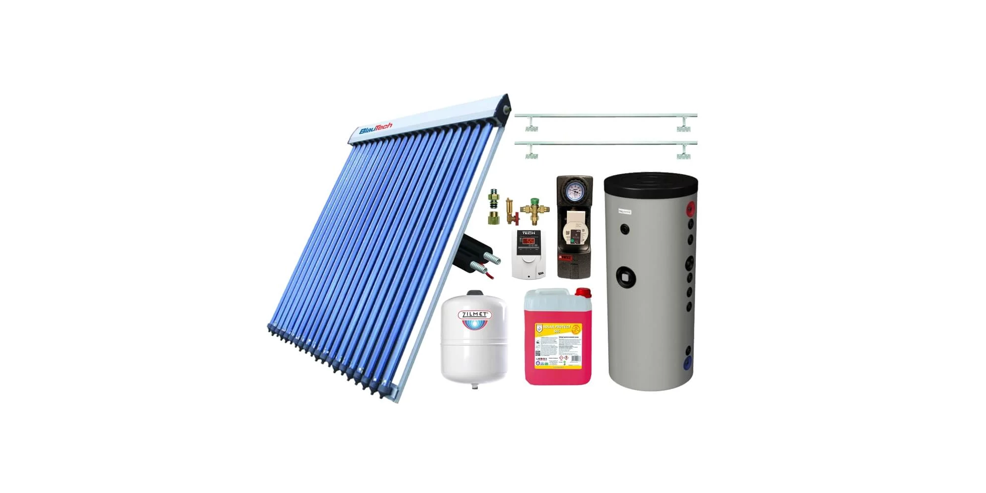 KIT S 14 cu colector solar 30 tuburi BlauTech-SOLAR, boiler indirect cu 2 serpentine Hajdu Aquastic 300 l, grup pompare Pumpfix SOLAR EASY, controler solar TECH EU-21ND3, vas expansiune, set fixare și tub inox este soluția perfectă pentru a reduce factura la energie și pentru a contribui la protejarea mediului înconjurător.