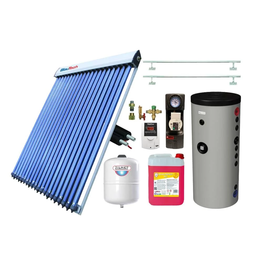 Pachet solar KIT S 14 cu colector solar 30 tuburi BlauTech-SOLAR, boiler indirect cu 2 serpentine Hajdu Aquastic 300 l, grup pompare Pumpfix SOLAR EASY, controler solar TECH EU-21ND3, vas expansiune, set fixare si tub inox