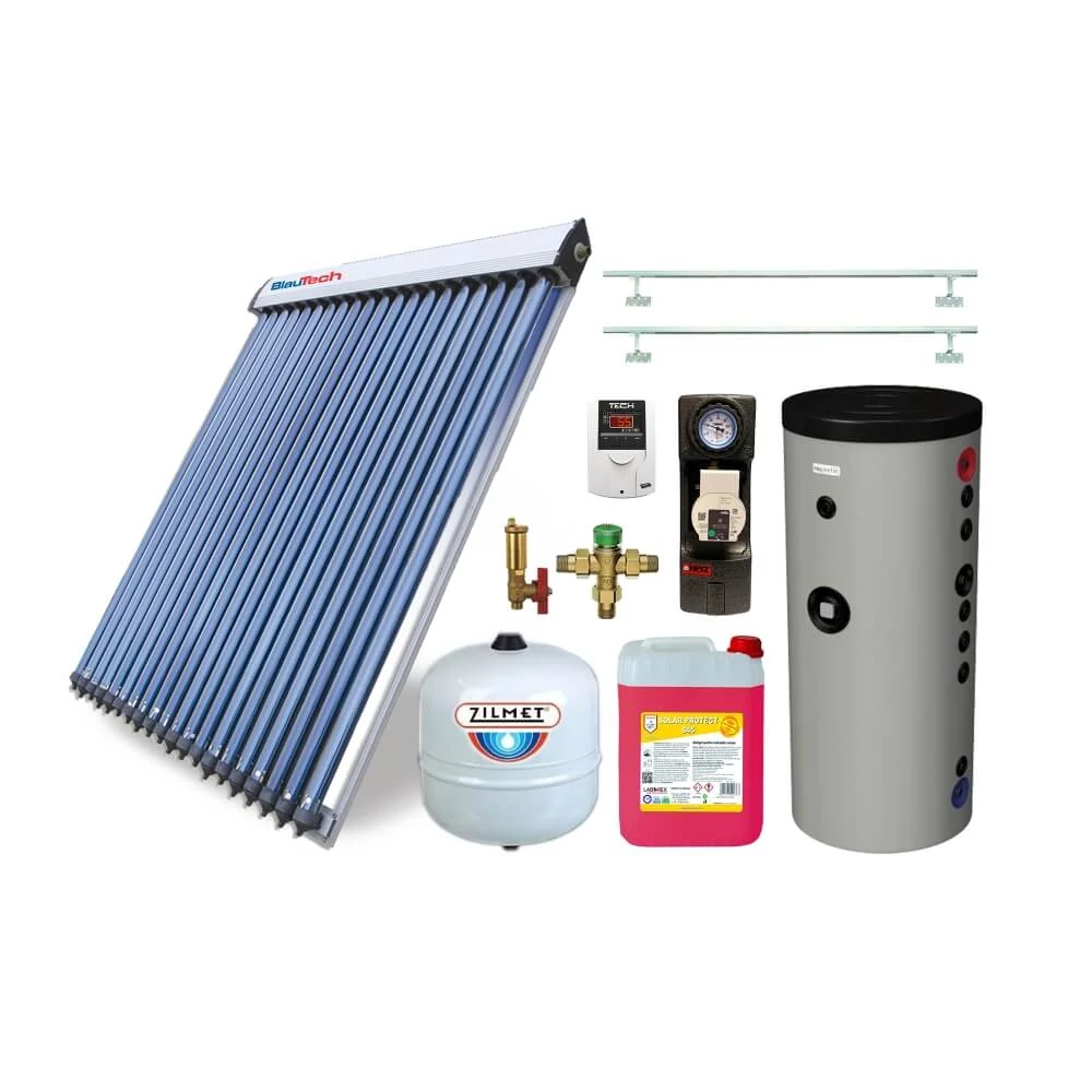 Componentele kit-ului sunt de înaltă calitate și au fost selectate cu grijă pentru a asigura o funcționare optimă și o durabilitate mare a sistemului. Colectorul solar cu 20 tuburi vidate BlauTech-SOLAR presurizat este unul dintre cele mai performante modele de pe piață, cu o eficiență ridicată în colectarea energiei solare și o construcție solidă și durabilă.