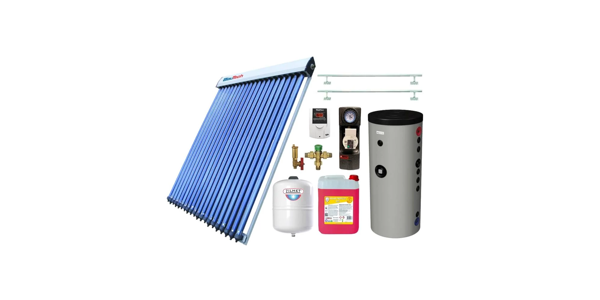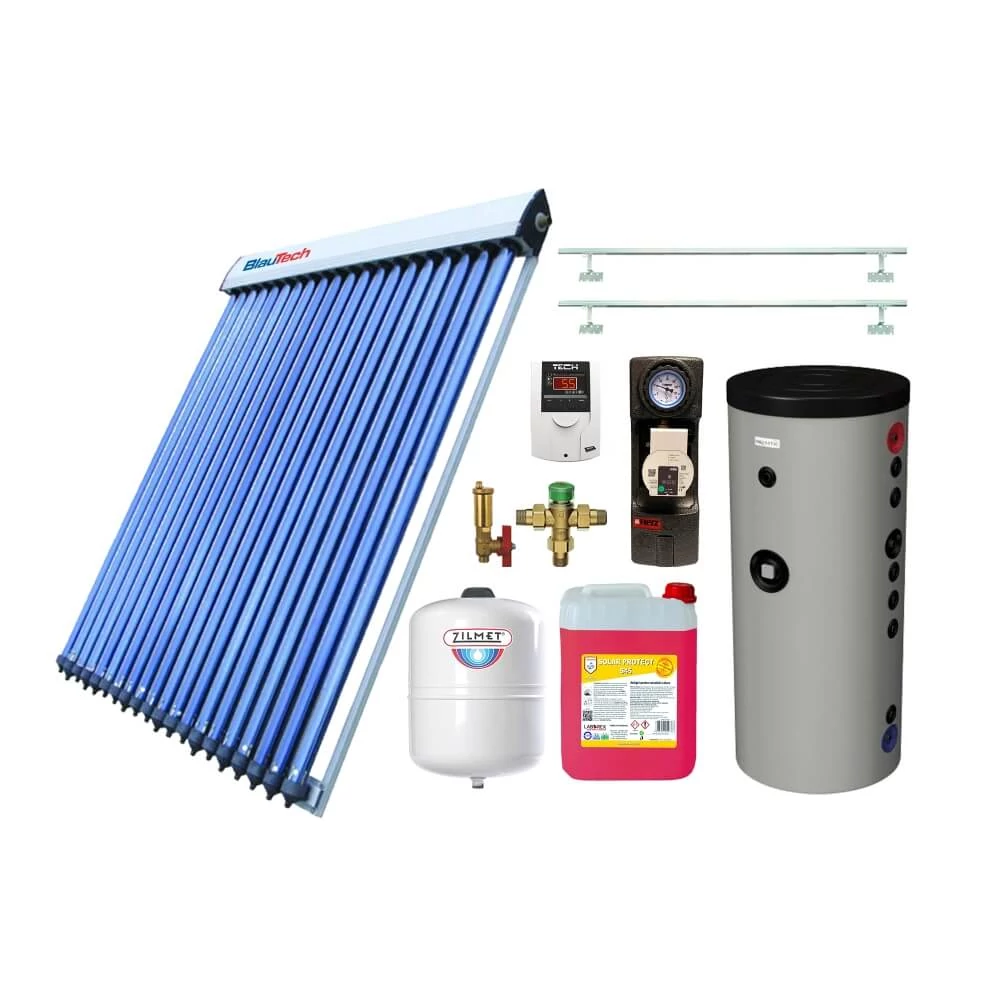 Pachet solar KIT S13 cu colector solar 30 tuburi BlauTech-SOLAR, boiler indirect cu 2 serpentine Hajdu Aquastic 300 l, grup pompare Pumpfix SOLAR EASY, controler solar TECH EU-21ND3, vas expansiune si set fixare | 00700133 | 10.099,00 Lei | Pachete solare | Confort prin instalații de calitate | Melinda InstalSpecificații tehnice