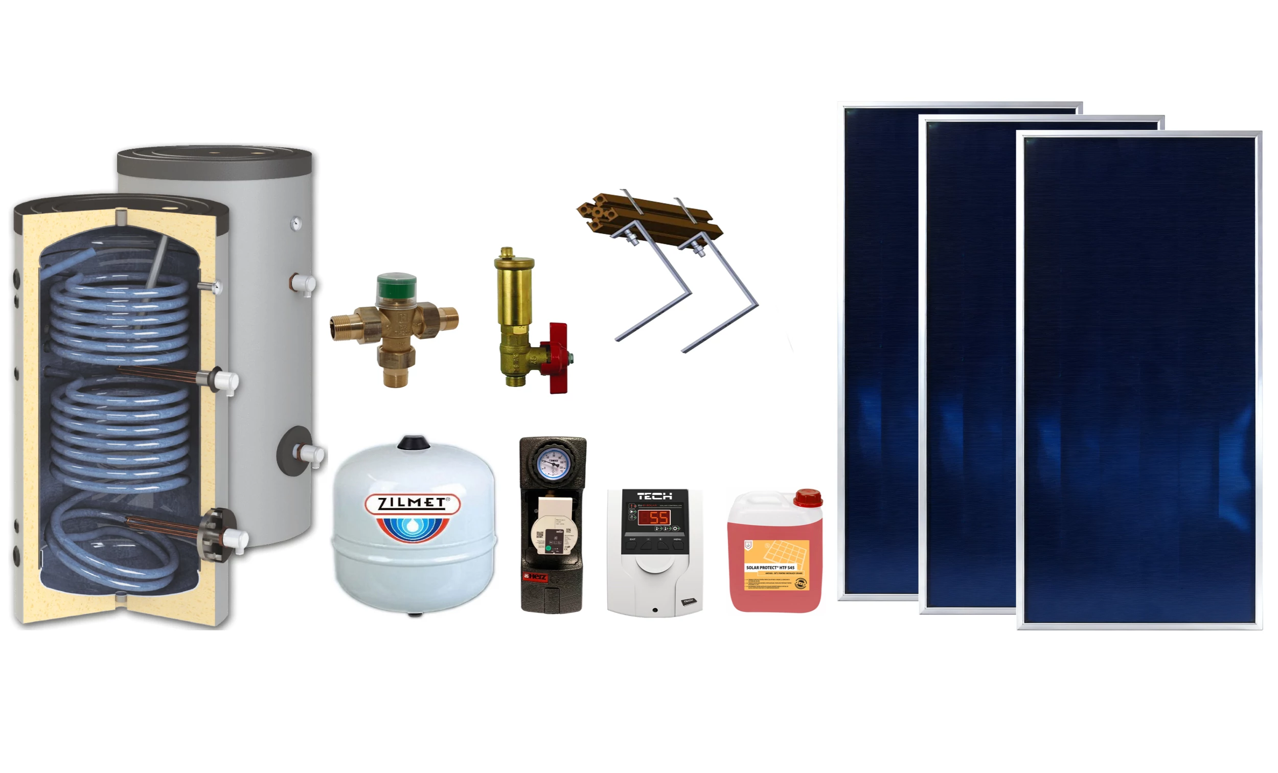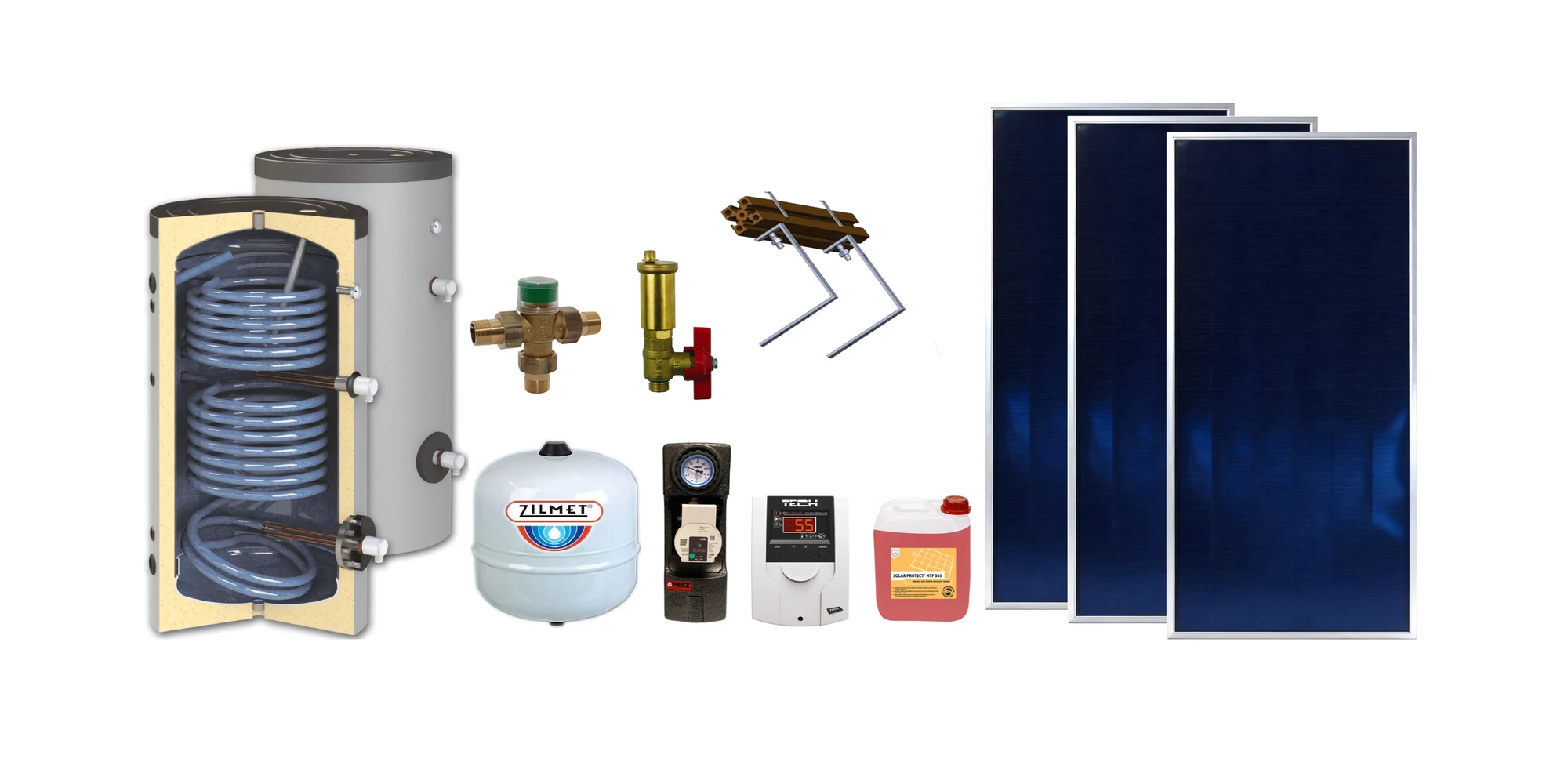 Pachet solar KIT S30, 3 panouri plane 2 mp BlauTech Plus, boiler indirect 300 l HeizTech, grup pompare Pumpfix, controler TECH, vas expansiune, lichid solar si set fixare