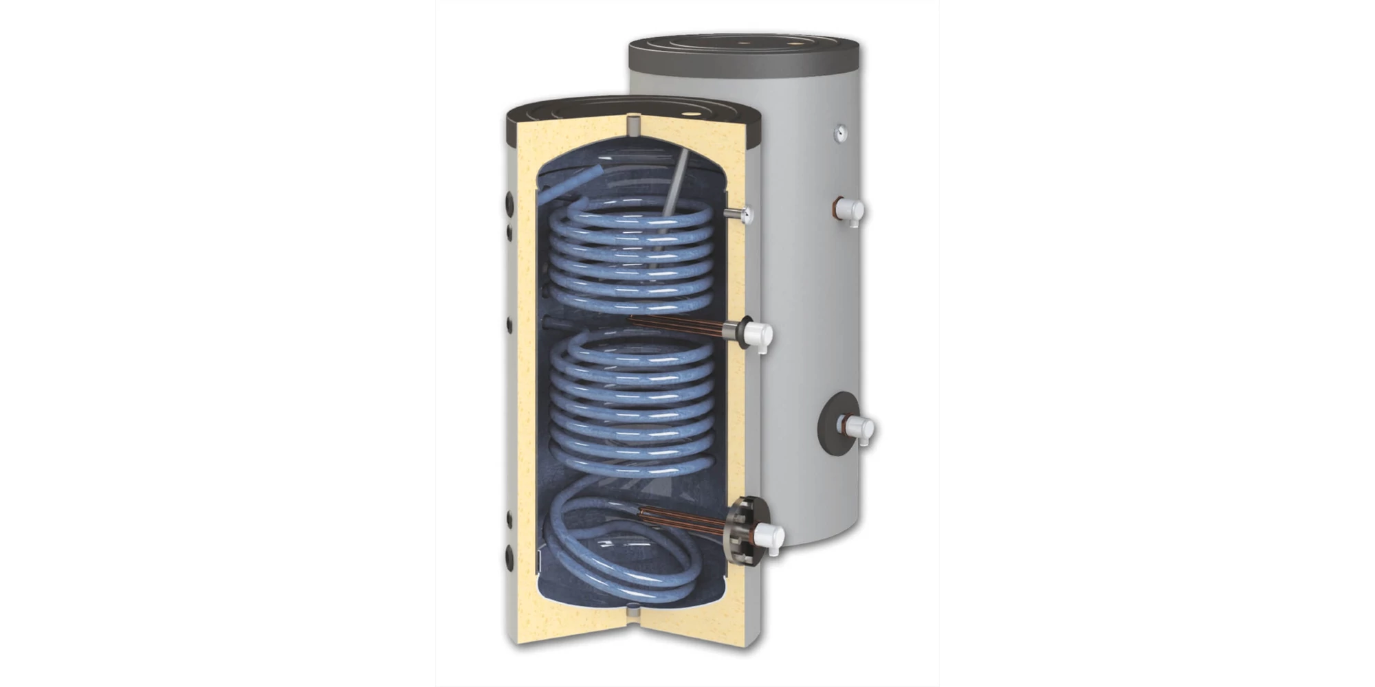 - Boiler indirect HeizTech 300 l cu 2 serpentine – Serpentina inferioară este dedicată circuitului solar, iar serpentina superioară poate fi conectată la centrala termică, permițând utilizarea simultană sau alternativă a celor două surse de energie.