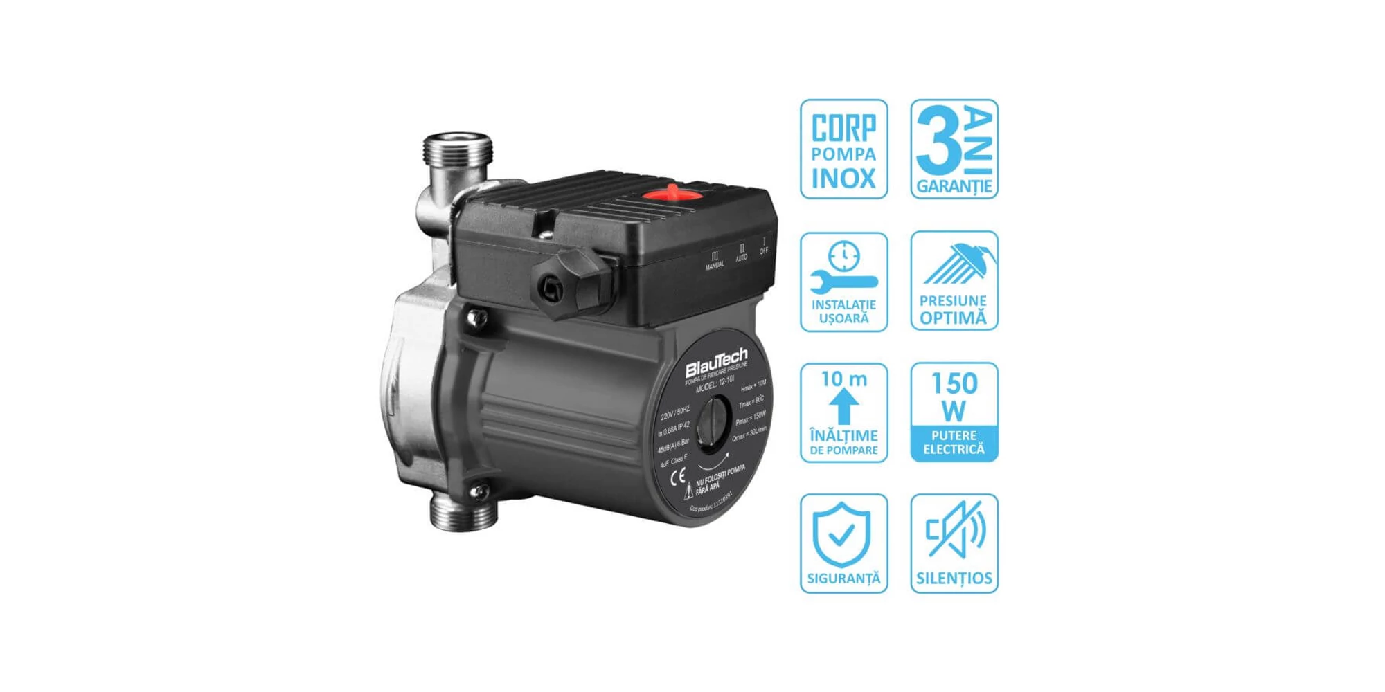Pompa de ridicare a presiunii pentru panourile solare nepresurizate cu corp din oțel inoxidabil BlauTech oferă soluția pentru creșterea presiunii în instalațiile interioare de apă caldă. Această pompă poate rezolva problema lipsei de presiune atunci când panoul solar nepresurizat este montat la o înălțime mică. Pompa este dotată cu un întrerupător automat controlat de scurgerea apei, care pornește pompa când un robinet este deschis și o oprește când robinetul este închis.