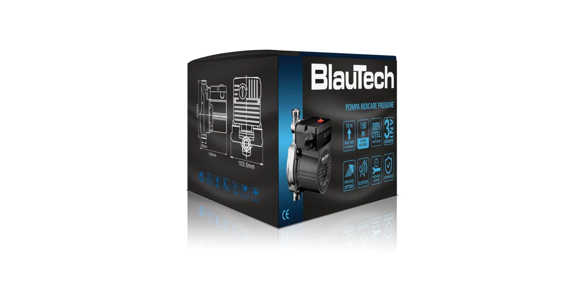 Pompa de ridicare a presiunii cu corp din oțel inoxidabil BlauTech se instalează între rezervorul solar nepresurizat și consumatorul de apă caldă. În momentul montării instalației solare nepresurizate, rezervorul panoului solar trebuie amplasat deasupra nivelului bateriei de amestec, la o înălțime minimă de 3 metri (recomandat 5 metri), astfel încât, atunci când rezervorul este deschis, să se asigure un debit minim care să activeze întrerupătorul automat și să pornească pompa. Înainte de pompa, trebuie montat o clapetă de reținere în poziție orizontală. Se recomandă instalarea unui filtru fin pe conducta de alimentare cu apă. Instalația de alimentare cu apă trebuie să fie realizată din conducte sanitare rezistente la coroziune și fără rugină.