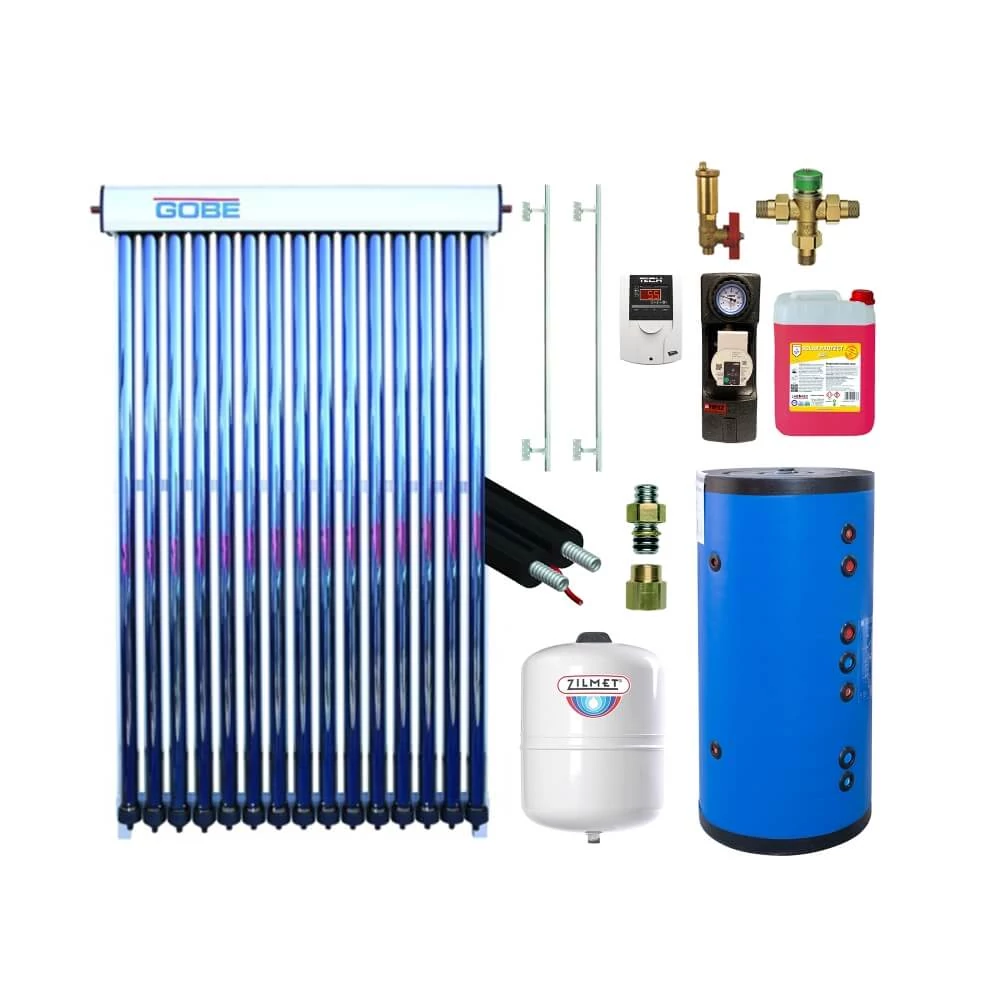 Pachet solar KIT S8 cu colector solar 30 tuburi GOBE, boiler cu 2 serpentine 300 l HeizTech, grup pompare Pumpfix SOLAR EASY, controler solar simplu TECH EU-21ND3, lichid solar, vas expansiune, set fixare, ventil termostatic