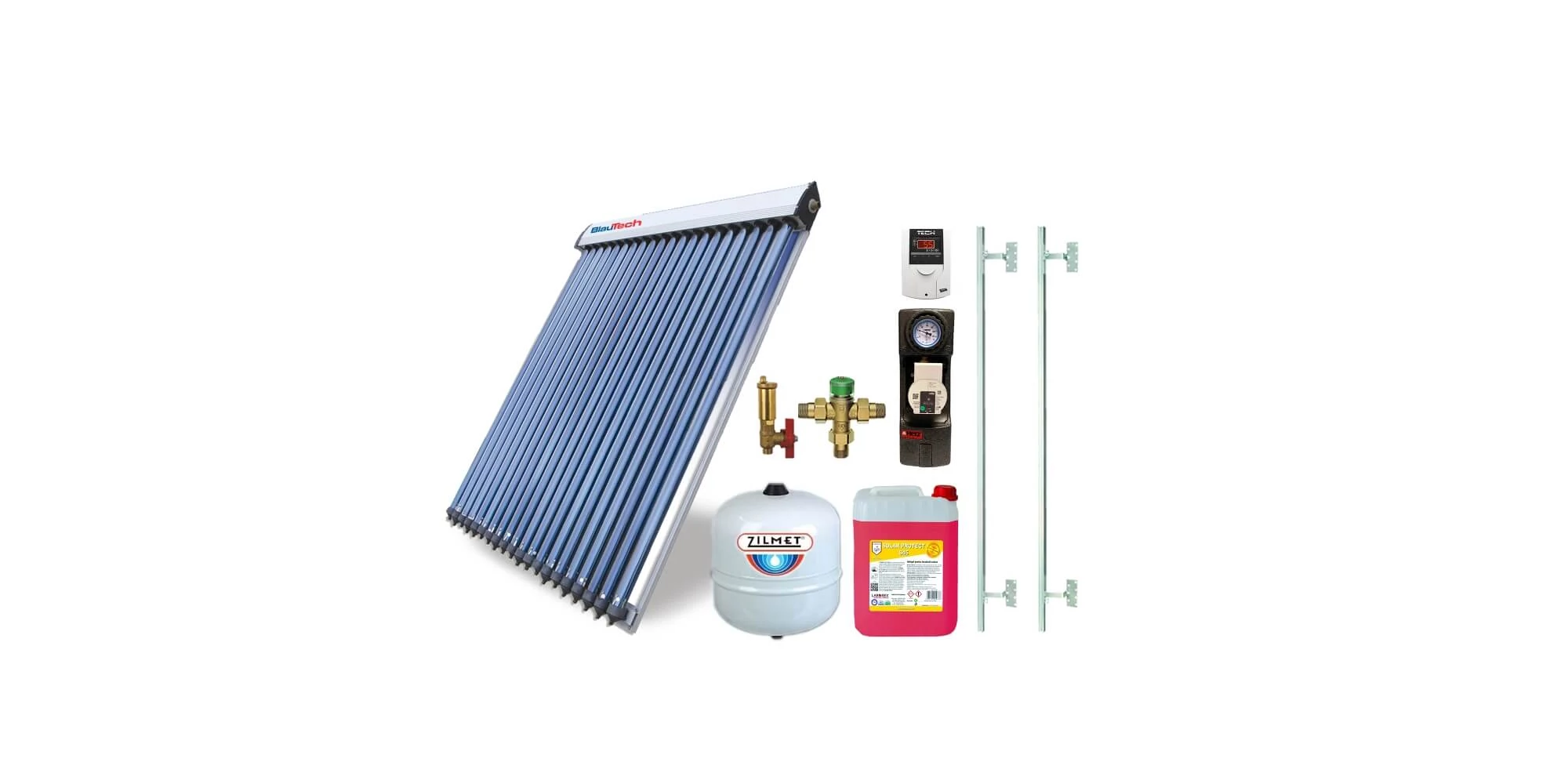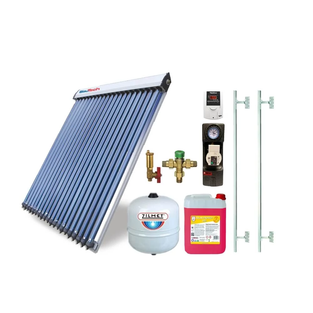 Pachet solar KIT S9 cu colector solar 20 tuburi BlauTech-SOLAR, grup pompare Pumpfix SOLAR EASY, controler solar TECH EU-21ND3, vas expansiune, lichid solar si set fixare