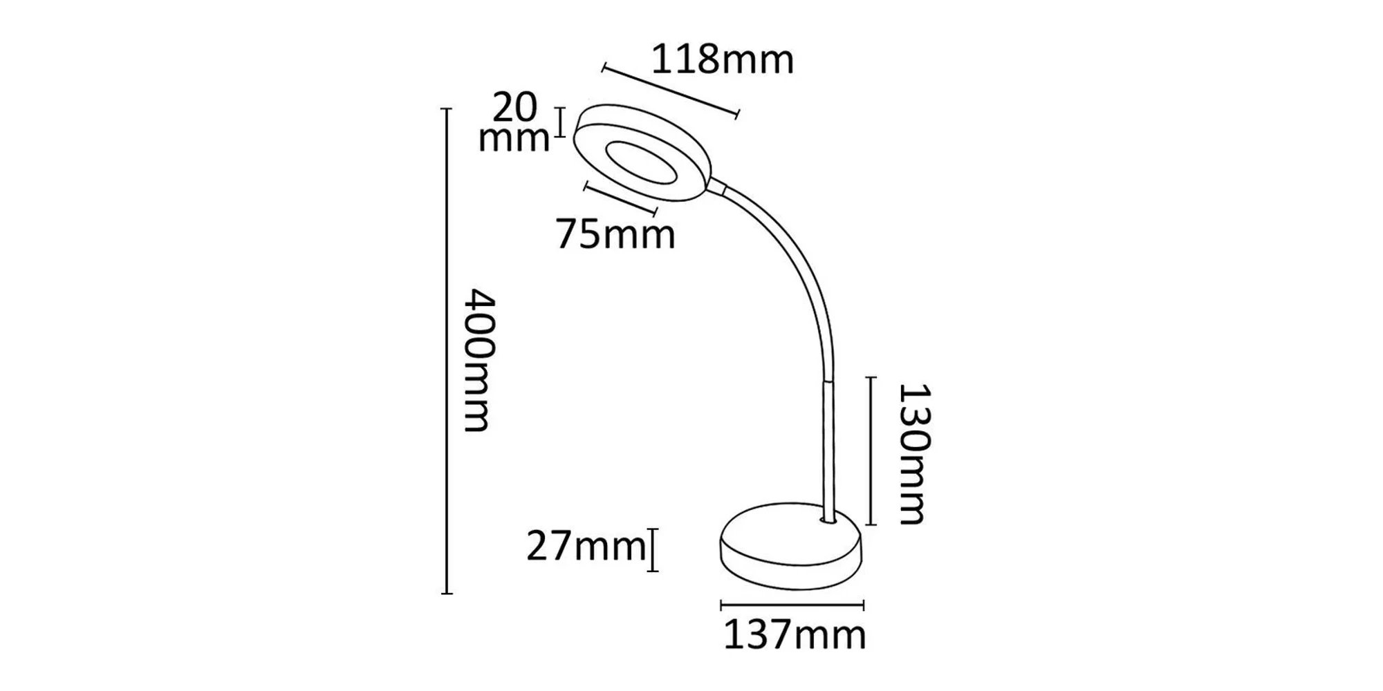 Lampa de masa LED, alb, 6 W, 4000K, 500 lm, ASAL0203 ASALITE cu temperatura de culoare a lămpii de masă cu LED ASALITE 6 W este de 4000 grade Kelvin, lumina fiind albă neutră. Produsul are un flux luminos extrem de mare de 500 Lumeni la o putere de 6 W. Cu dimensiunile sale de 137 x 400 mm poate fi amplasat în mod practic, necesarul său de spațiu fiind extrem de mic. Cablul de alimentare are o lungime de 2 m, produsul putând fi mutat cu ușurință, lucru facilitat și de greutatea sa mică de 0,46 kg. Unghiul de iluminare este de 120 de grade, fiind o alegere ideală pentru utilizare continuă pe termen lung. Gâtul cauciucat permite reglarea poziției lămpii.