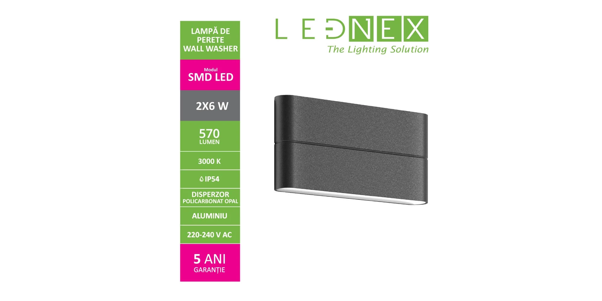 Lampa de perete LED dreptunghiular, 2 x 6 W, 570 LM, IP54, LEDNEX