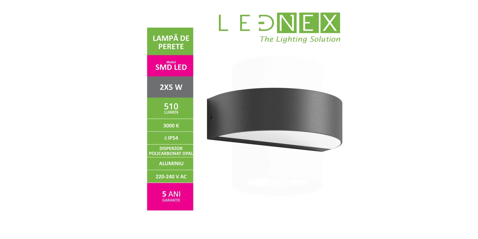 Lampa de perete LED, semirotunda, 2 x 5 W, 510 LM, IP54, LEDNEX