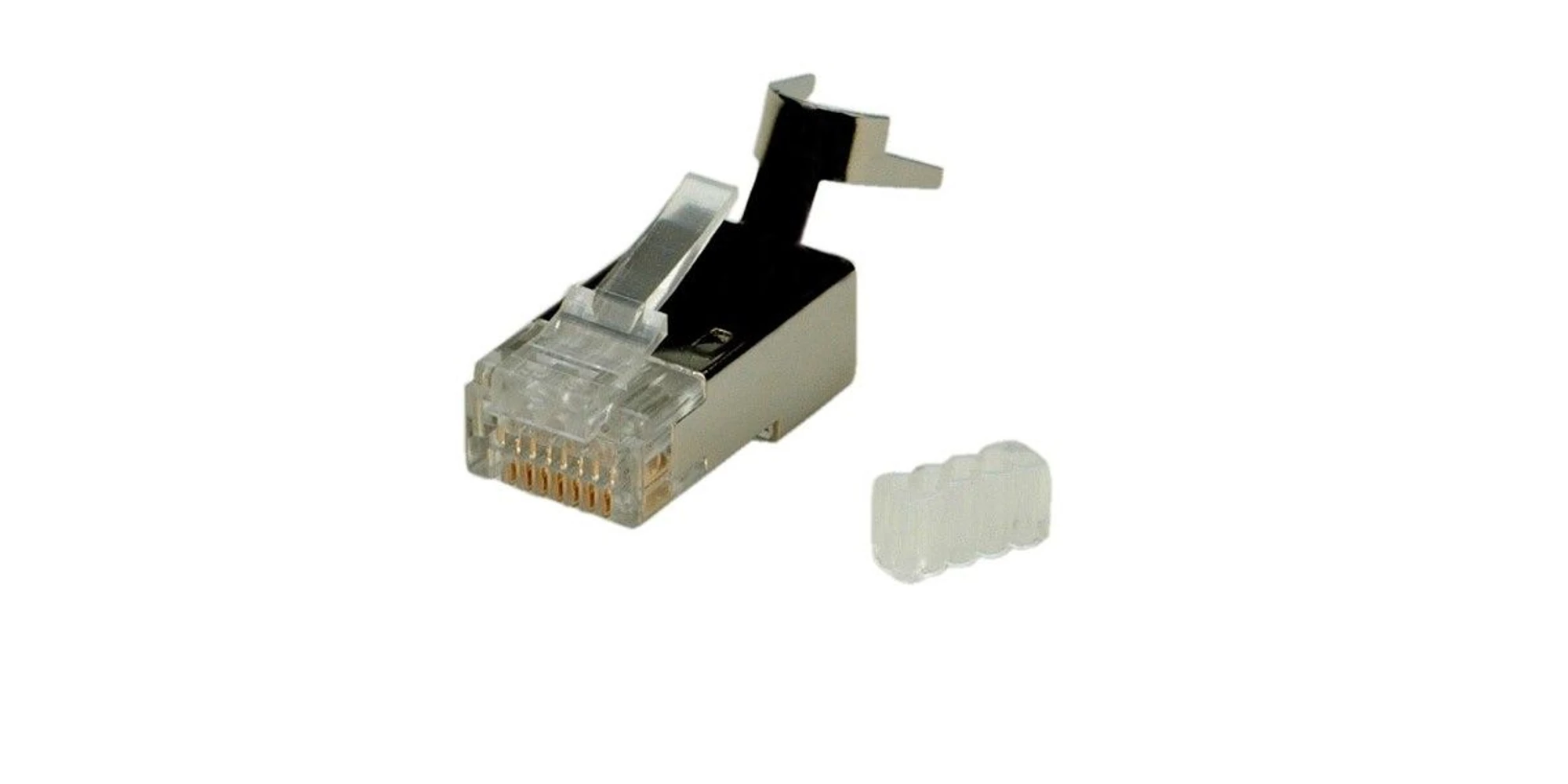 Mufă RJ45 CAT5 pentru cablu de date CAT6 cu fir solid. Cu ajutorul unui cablu și a 2 mufe conectate, se poate obține o conexiune comunicare de date dintre orice 2 dispozitive cu o conexiune Ethernet.