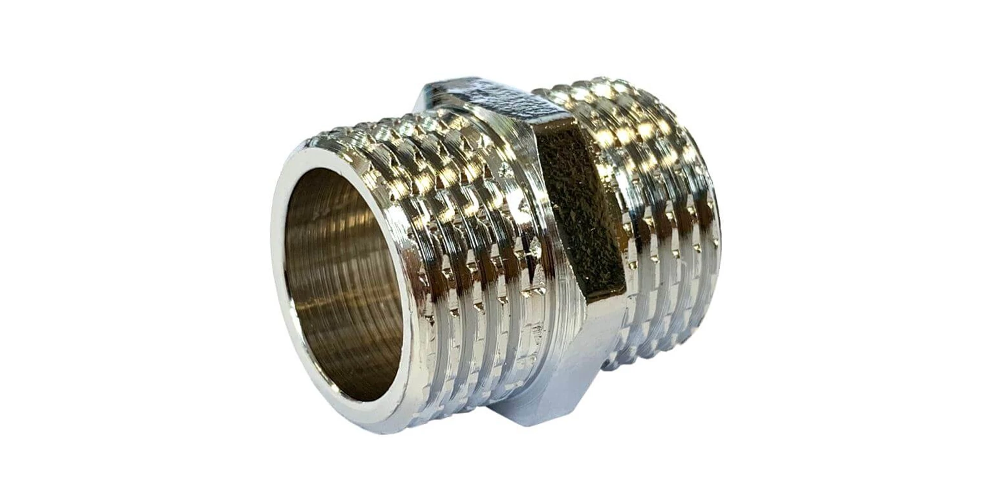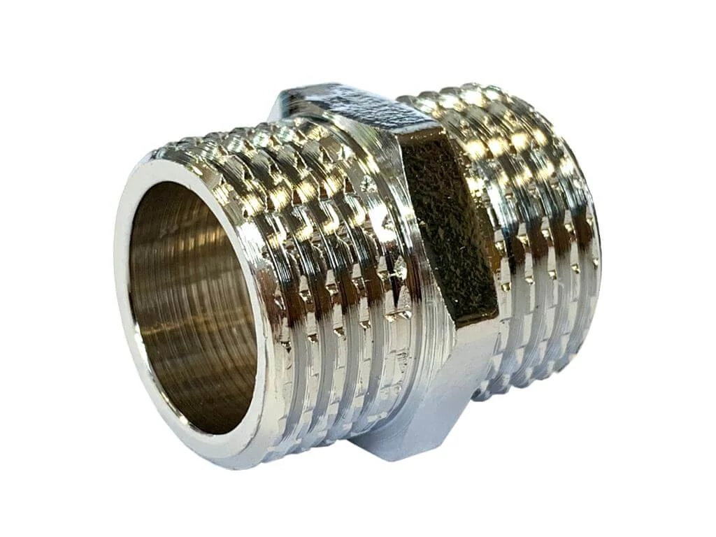 Niplu din alama cromata filet exterior-filet exterior, pentru imbinari prin filet 3/8", GOBE | 10270102 | 2,35 Lei | Niplu din alama cromat | Confort prin instalații de calitate | Melinda Instal