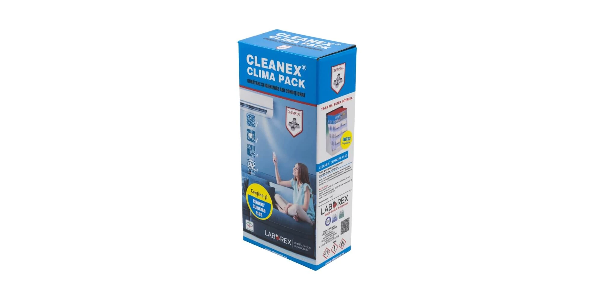 Pachetul curățare și igienizare pentru aparate de aer condiționat CLEANEX CLIMA PACK facilitează operațiunile de curățare și igienizare ale aparatelor de aer condiționat prin intermediul spray-ului detergent cu spumă activă CLEANEX CLIMANET PLUS (600 ml), a igienizantului cu acțiune bacteriostatică CLEANEX CLIMASAN PLUS (400 ml) și a pastilelor igienizante pentru condens CLEANEX CLIMATAB PLUS.