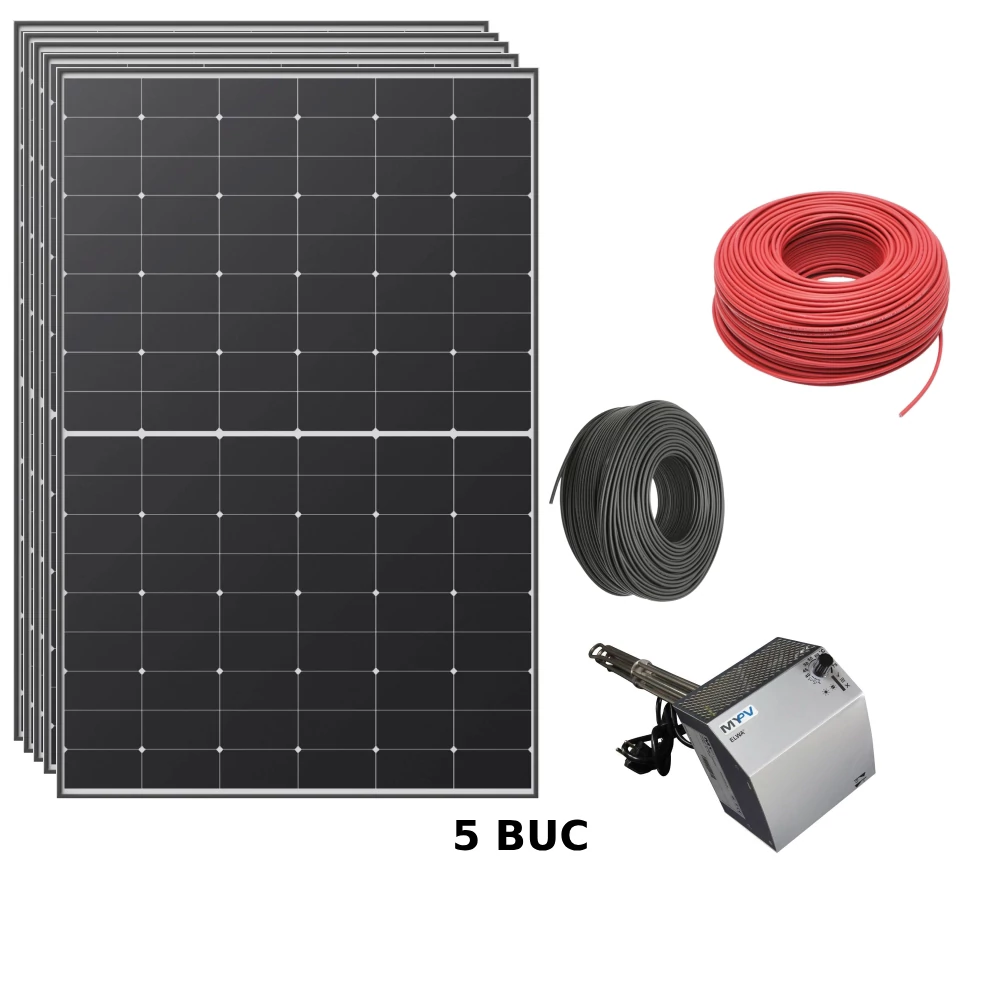 Pachet fotovoltaic 2 kW, cu panou solar fotovoltaic, monocristalin, 435 W, cu cadru negru, LR5-54HTH-435M, LONGi, rezistenta electrica 2000 W fotovoltaica ACM, DC2000W 100-360 myPV, cabluri si accesorii
