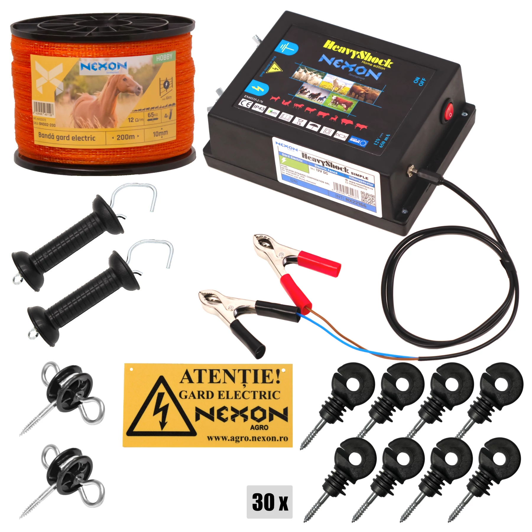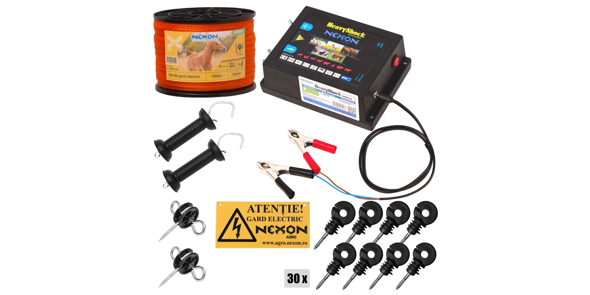Pachet gard electric NEXON Simple 2.5J 12V, Banda 200 m 3 lite 60 kg