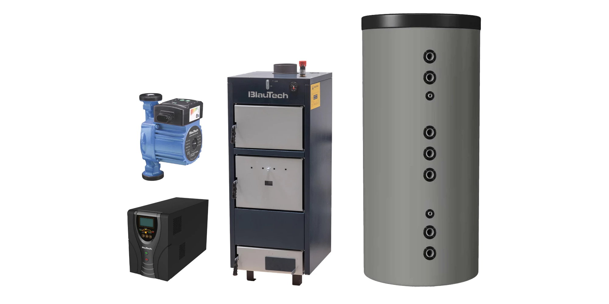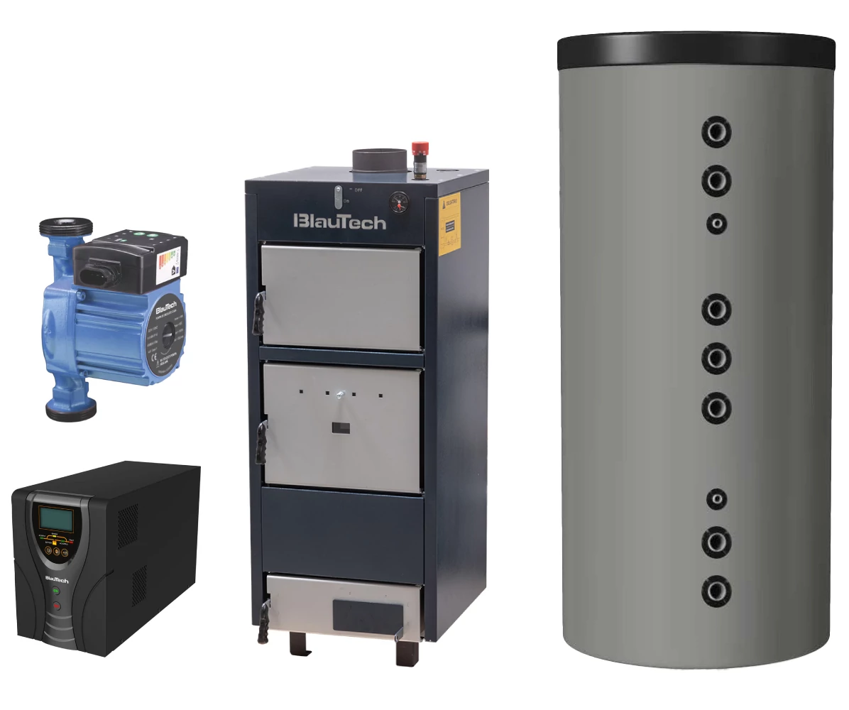 Pachet încălzire cu cazan pe lemne din tablă de oțel 28 kW BlauTech, pompa de circulație 25-40 180 mm, sursa neîntreruptibilă 300 W, rezervor de acumulare 1000 l, izolație termică 110 mm, BlauTech