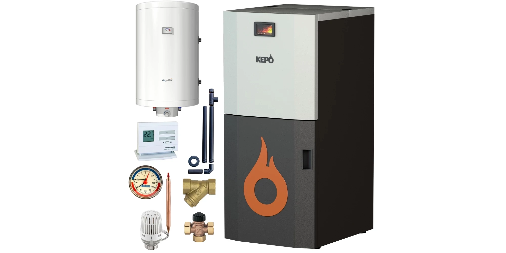Pachet încălzire PREMIUM cu cazan pe peleți, cu curățarea automată a arzătorului, 20 kW KEPO, cu KIT de instalare și boiler termoelectric conține următoarele componente: