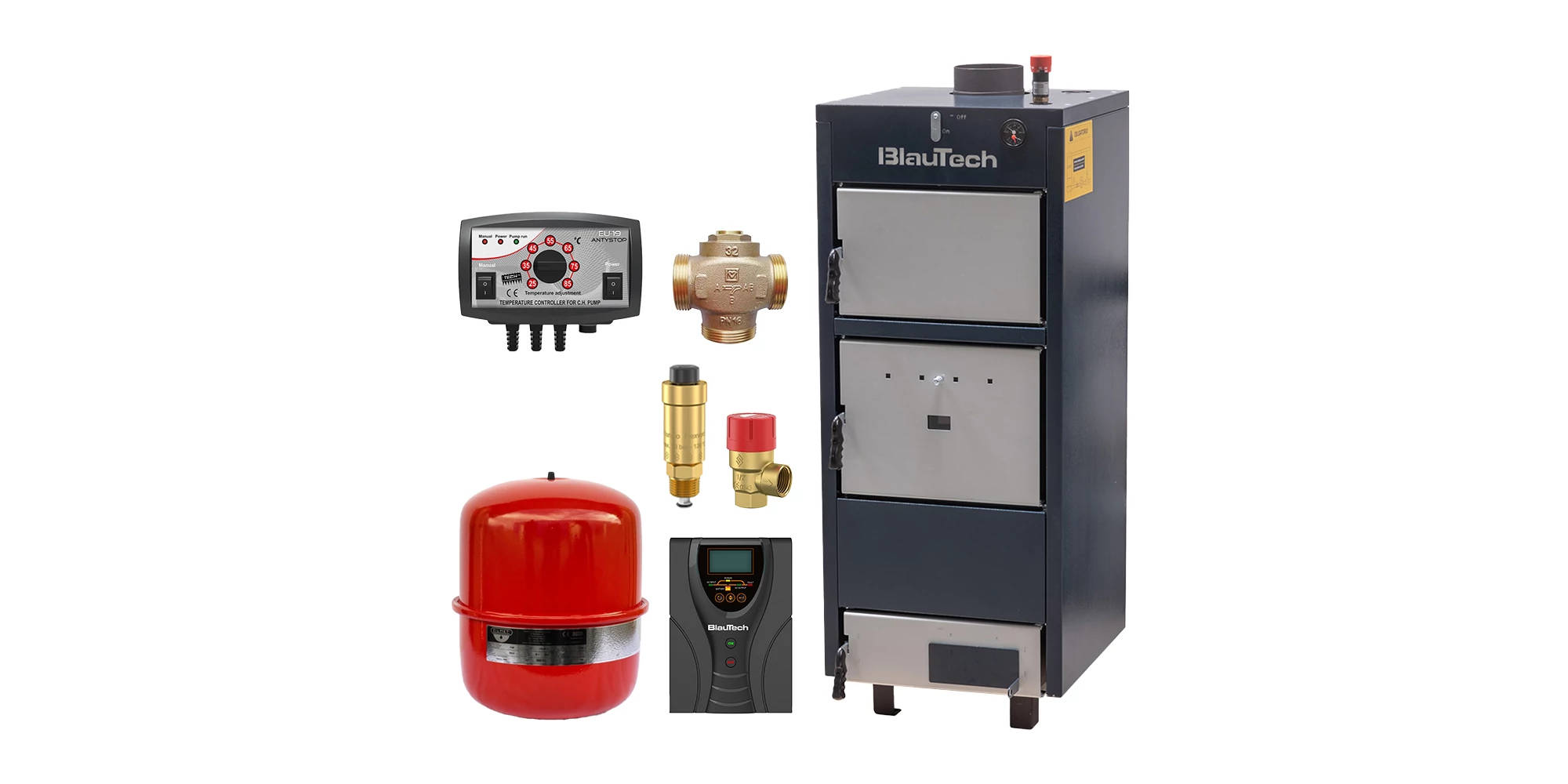 Pachet incalzire Standard cu cazan pe lemne din tabla de otel 37 kW BlauTech, sursa neintreruptibila 300 W BlauTech, elemente de siguranta, vas expansiune, controler pompa TECH EU-19