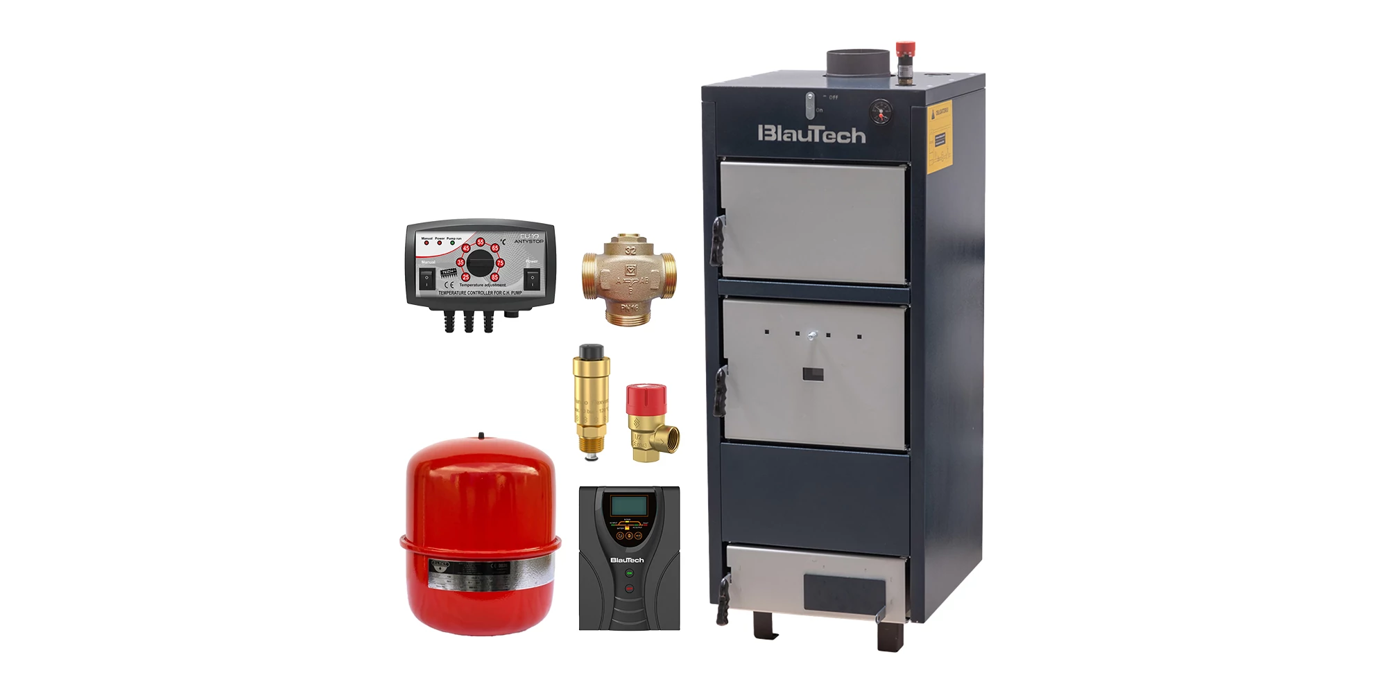 Pachet incalzire Standard cu cazan pe lemne din tabla de otel 47 kW BlauTech, sursa neintreruptibila 300 W BlauTech, elemente de siguranta, vas expansiune, controler pompa TECH EU-19