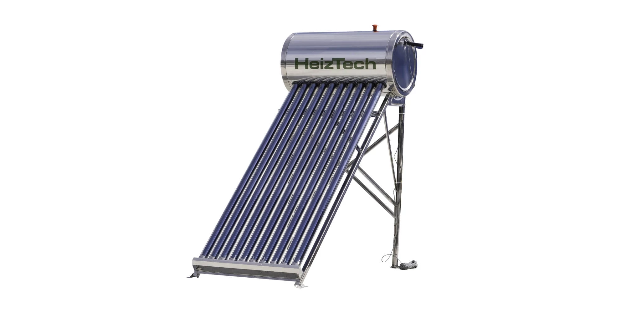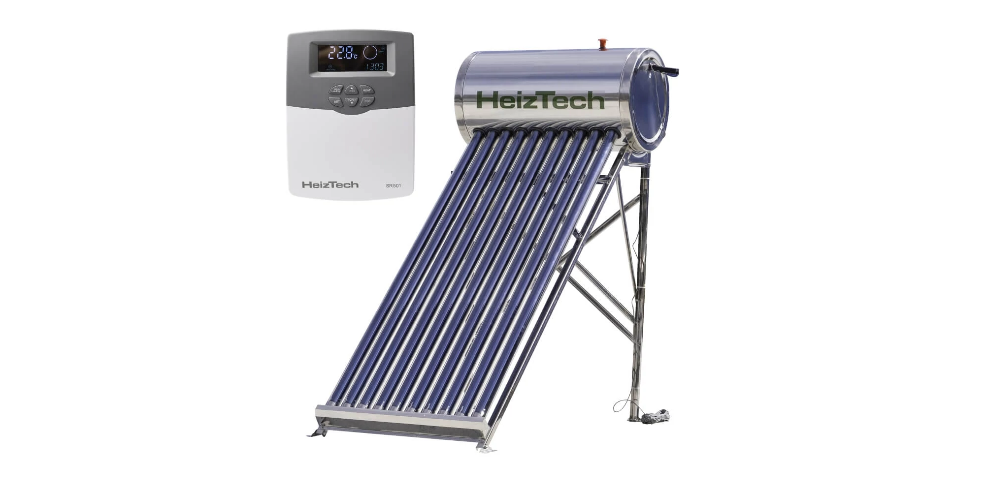 Panou solar 100 litri automatizat nepresurizat cu 10 tuburi vidate rezervor si suport otel inoxidabil pentru preparare apa calda menajera controler SR501 HeizTech