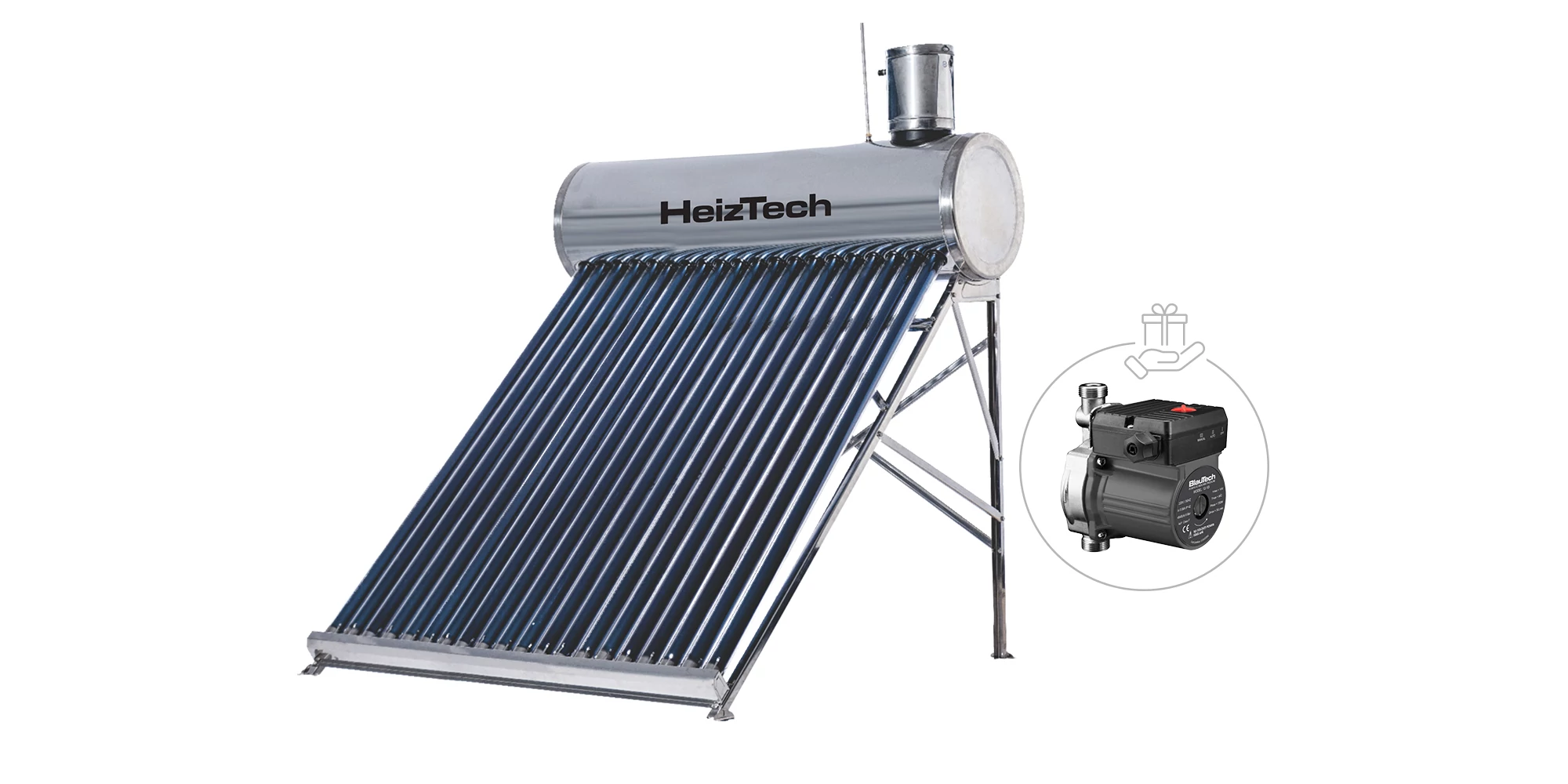 Panou solar 200 litri nepresurizat cu 20 tuburi vidate rezervor si suport otel inoxidabil pentru preparare apa calda menajera HeizTech | 10840295 | 2.479,00 Lei | Panouri solare cu rezervor nepresurizat | Confort prin instalații de calitate | Melinda Instal