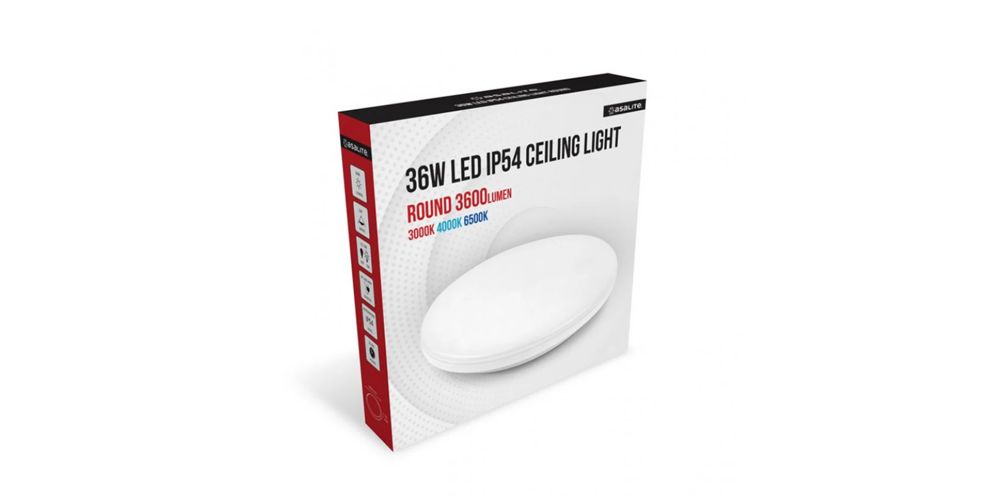 Plafoniera cu LED-uri ASALITE 36 W 3000K/4000K/6500K este capabilă de 3600 de lumeni la 36 W. Acesta poate ilumina un spațiu la 120 de grade, ceea ce îl face alegerea optimă pentru iluminarea spațiului de locuit (băi, scări, curți, terase, copertine etc.). Produsul este proiectat pentru 12.500 de cicluri de pornire/oprire.