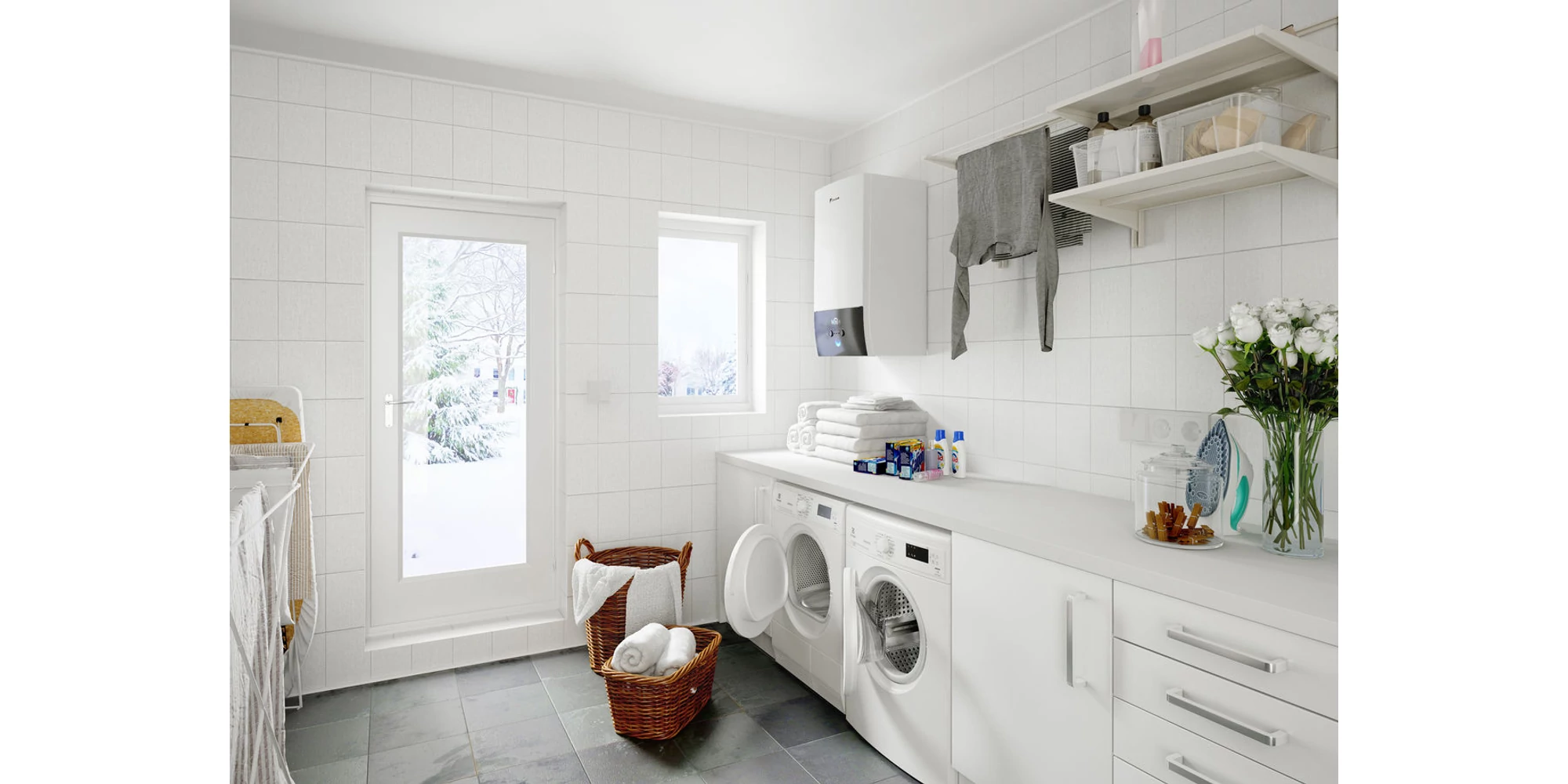 Modelul ETBX16E9W7 este conceput special pentru încălzire-răcire și se instalează în interiorul locuinței, pe perete, fără a ocupa mult spațiu. Dimensiunile compacte (840 mm înălțime, 440 mm lățime și 390 mm adâncime) permit montajul în camere tehnice de mici dimensiuni sau chiar în spații comune, datorită aspectului modern, în culori neutre (alb și negru).