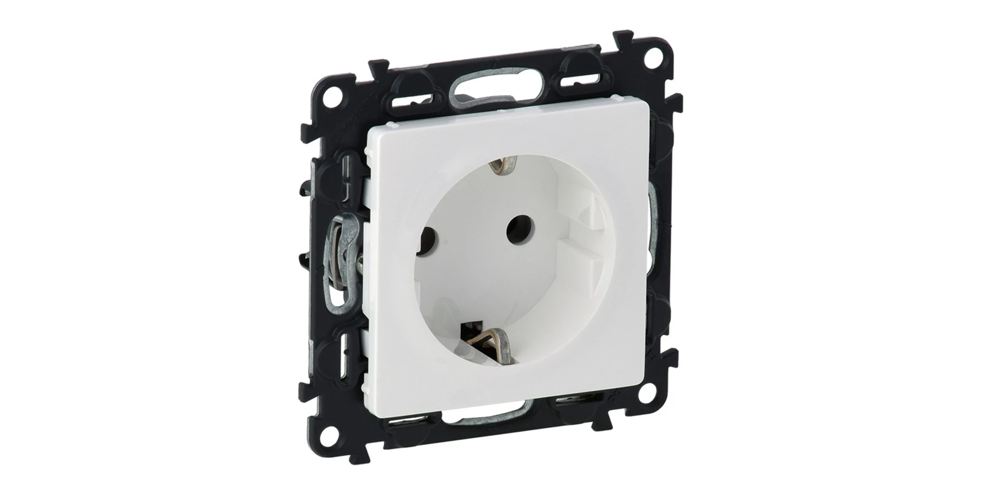 Priză simplă cu protecție copii LEGRAND VALENA LIFE 753120, priză cu împământare (fișă) cu protecție pentru copii și cu carcasă albă, fără ramă, încastrată.