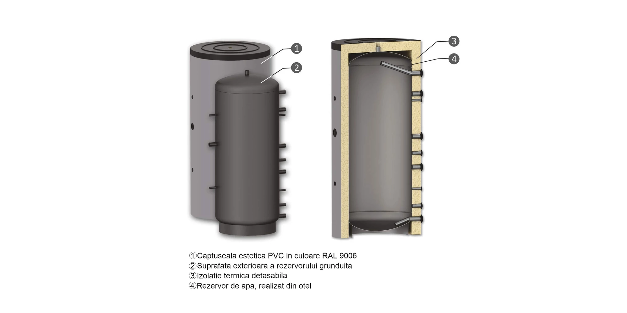 Rezervorul este echipat cu o izolație detașabilă cu o grosime generoasă de 100 mm. Această izolație de înaltă calitate contribuie la menținerea temperaturii interne, reducând astfel pierderile de căldură. În plus, rezervorul are un capitonaj extern din PVC în culoarea RAL 9006, care nu doar oferă protecție suplimentară, ci și un aspect estetic plăcut.